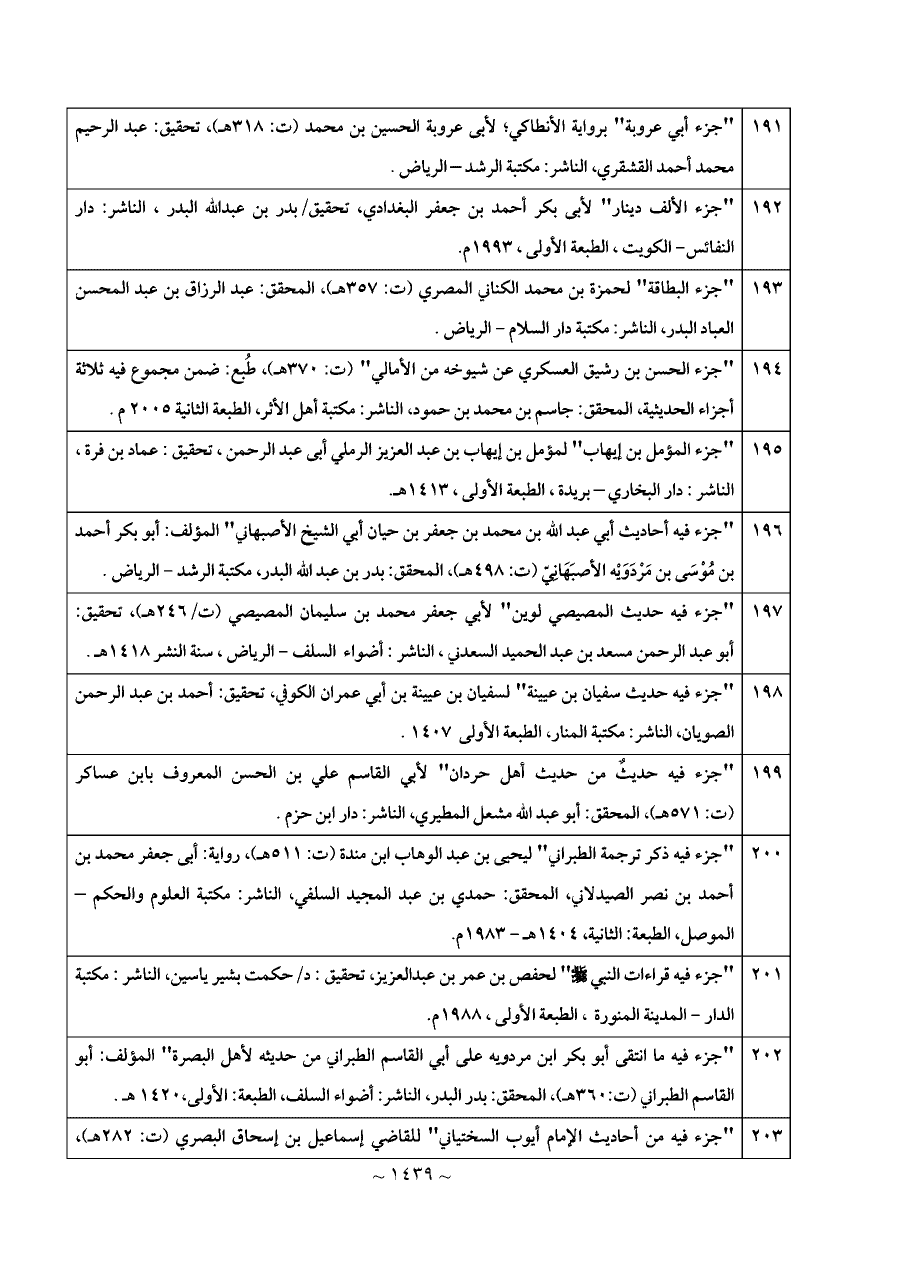 ٢٠٣ - "جزء فيه من أحاديث الإمام أيوب السختياني" للقاضي إسماعيل بن إسحاق البصري (ت: ٢٨٢ هـ)، المحقق: د/سليمان بن عبد العزيز العريني، الناشر: مكتبة الرشد - السعودية.