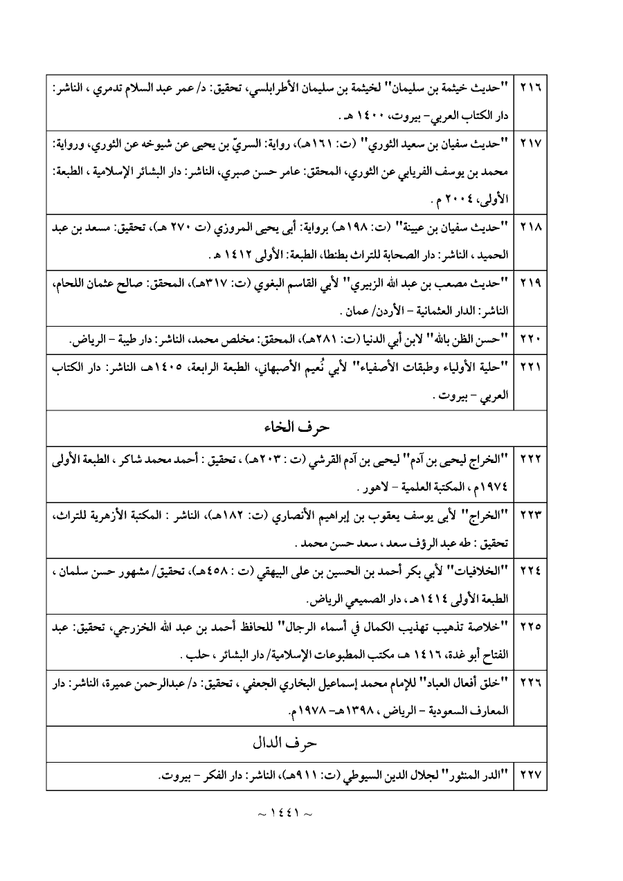 ٢١٦ - "حديث خيثمة بن سليمان" لخيثمة بن سليمان الأطرابلسي، تحقيق: د/عمر عبد السلام تدمري، الناشر: دار الكتاب العربي - بيروت، ١٤٠٠ هـ.