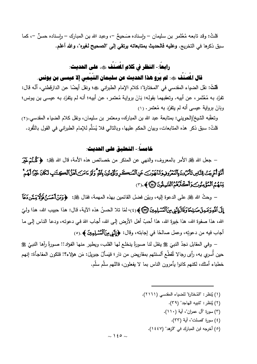 قلتُ: نقَل الضياء المقدسي في "المختارة": كلام الإمام الطبراني - رضي الله عنه -؛ ونقل أيضًا عن الدارقطني، أنَّه قال: تفرّد به مُعْتَمر، عن أبيه. وتعقبهما بقوله: بَانَ برواية مُعتمر، عن أبيه؛ أنه لم يتفرّد به عيسى بن يونس؛ وبَانَ برواية عيسى أنه لم يتفرّد به مُعتمر. (¬١)