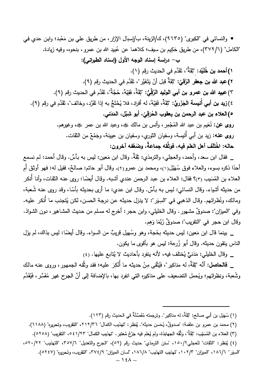 ٤) زيد بن أبي أُنيسة الجَزَريُّ: "ثِقَةٌ، فَقِيْهٌ، له أفراد، فلا يُحْتَجُّ به إذا تَفَرَّد، وخالف"، تَقَدَّم في رقم (٩).