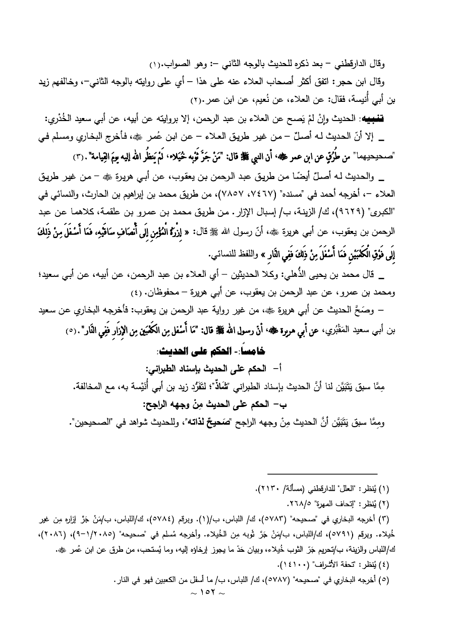 _ إلا أنّ الحديث له أصلٌ - من غير طريق العلاء - عن ابن عُمر - رضي الله عنه -، فأخرج البخاري ومسلم في "صحيحيهما" من طُرُقٍ عن ابن عمر - رضي الله عنه -، أن النبي - صلى الله عليه وسلم - قال: "مَنْ جَرَّ ثَوْبه خُيَلاء، لَمْ يَنظُر الله إليه يومَ القِيامة". (¬٣)