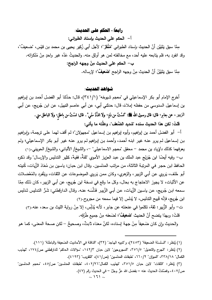 ب وفيه أيضًا ابن جُرَيْج عبد الملك بن عبد العزيز الأموي "ثقةٌ، فقيهٌ، كثير التدليس والإرسال" وقد ذكره الحافظ ابن حجر في المرتبة الثالثة، من مراتب المدلسين. وقال ابن حبان: ياسين بن مُعَاذ الزَّيات، كُنيته أبو خَلف، يَروي عن أبي الزبير، والزهري، وكان ممن يَروي الموضوعات عن الثقات، ويَنْفرد بالمُعْضلات عن الأثبات، لا يجوز الاحتجاج به بحال، وكل ما وقع في نسخة ابن جُريج، عن أبي الزبير، كان ذلك مِمَّا سمعه ابن جُريج، عن ياسين الزَّيات، عن أبي الزُبير فَدَلَّسَه عنه. وقال الدارقطني: شَرُّ التدليس تَدليس ... ابن جُريج، فإنَّه قَبيح التدليس، لا يُدلس إلا فيما سمعه من مجروح. (¬٢)