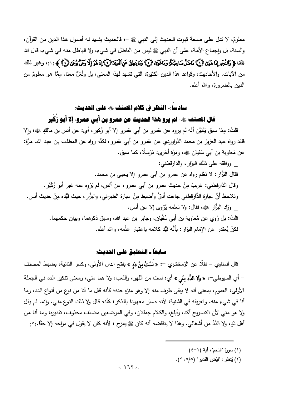 معلومٌ، لا تدل على صحة ثبوت الحديث إلى النبي - صلى الله عليه وسلم -؛ فالحديث يشهد له أصول هذا الدين من القرآن، والسنة، بل وإجماع الأمة، على أن النبي - صلى الله عليه وسلم - ليس من الباطل في شيء، ولا الباطل منه في شيء، قال الله - عز وجل -: {وَالنَّجْمِ إِذَا هَوَى (١) مَا ضَلَّ صَاحِبُكُمْ وَمَا غَوَى (٢) وَمَا يَنْطِقُ عَنِ الْهَوَى (٣) إِنْ هُوَ إِلَّا وَحْيٌ يُوحَى (٤)} (¬١)، وغير ذلك من الآيات، والأحاديث، وقواعد هذا الدين الكثيرة، التي تشهد لهذا المعنى، بل ولَعَلَّ معناه مِمَّا هو معلومٌ من الدين بالضرورة، والله أعلم.