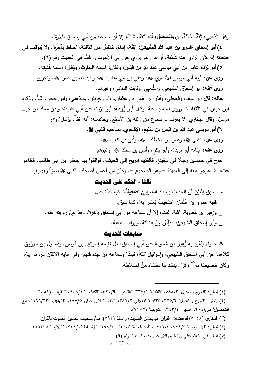 ٤) أبو إسحاق عَمرو بن عبد الله السَّبيعيُّ: "ثِقَة، إِمَامٌ، مُدَلِّسٌ من الثالثة، اختلط بآخرةٍ". ولا يُتوقف في عنعنته إذا كان الراوي عنه شُعْبَة، أو كان هو يَرْوي عن أبي الأحوص، تَقَدَّم في الحديث رقم (٩).