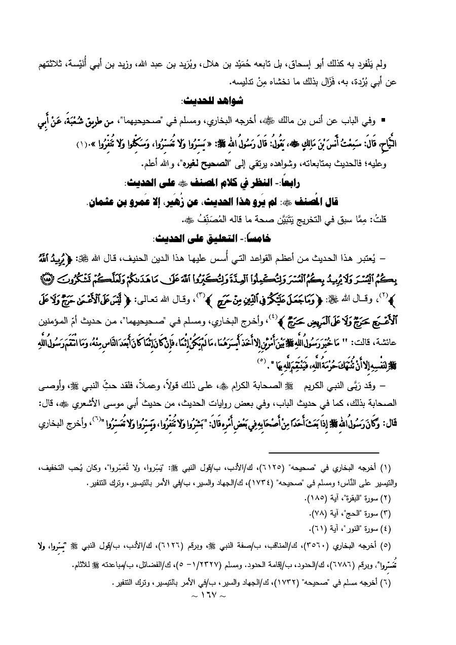 • وفي الباب عن أنس بن مالك - رضي الله عنه -، أخرجه البخاري، ومسلم في "صحيحيهما"، من طريق شُعْبَةَ، عَنْ أَبِي التَّيَّاحِ، قَالَ: سَمِعْتُ أَنَسَ بْنَ مَالِكٍ - رضي الله عنه -، يَقُولُ: قَالَ رَسُولُ اللهِ - صلى الله عليه وسلم -: «يَسِّرُوا وَلا تُعَسِّرُوا، وَسَكِّنُوا وَلا تُنَفِّرُوا». (¬١)
