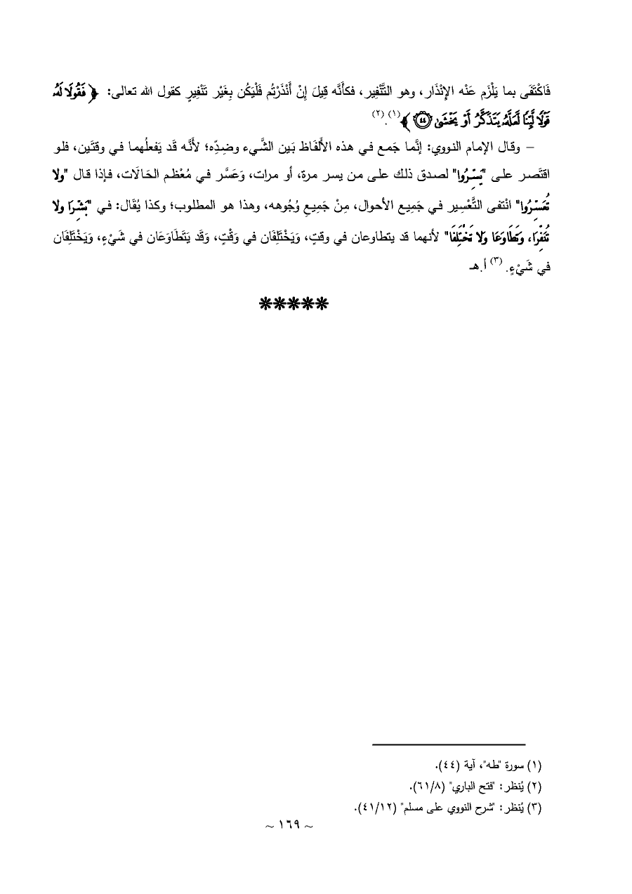 - وقال الإمام النووي: إنَّما جَمع في هذه الأَلفَاظ بَين الشَّيء وضِدِّه؛ لأَنَّه قَد يَفعلُهما في وقتَين، فلو اقتَصر على "يَسِّرُوا" لصدق ذلك على من يسر مرة، أو مرات، وَعَسَّر في مُعْظم الحَالَات، فإذا قال "ولا تُعَسِّرُوا" انْتفى التَّعْسِير في جَمِيع الأحوال، مِنْ جَمِيعِ وُجُوهه، وهذا هو المطلوب؛ وكذا يُقَال: في "بَشِّرَا ولا تُنَفِّرَا، وَتَطَاوَعَا وَلا تَخْتَلِفَا" لأنهما قد يتطاوعان في وقتٍ، وَيَخْتَلِفَان في وَقْتٍ، وَقَد يَتَطَاوَعَان في شَيْءٍ، وَيَخْتَلِفَان في شَيْءٍ. (¬٣) أ. هـ