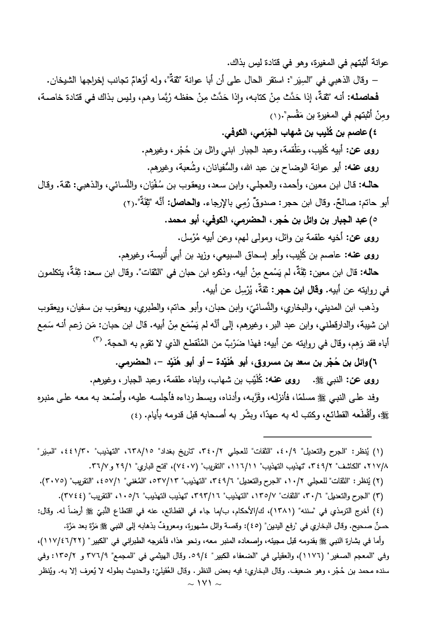 (¬٤) أخرج الترمذي في "سننه" (١٣٨١)، ك/الأحكام، ب/ما جاء في القطائع، عنه في اقتطاع النَّبيّ - صلى الله عليه وسلم - أرضاً له. وقال: حسنٌ صحيح. وقال البخاري في "رفع اليدين" (٤٥): وقصة وائل مشهورة، ومعروفٌ بذهابه إلى النبي - صلى الله عليه وسلم - مَرَّة بعد مَرَّة.