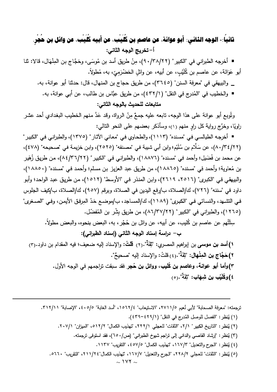 ثانيًا:- الوجه الثاني: أبو عوانة، عن عاصم بن كُلَيْب، عن أبيه كُلَيْب، عن وائل بن حُجْرٍ.