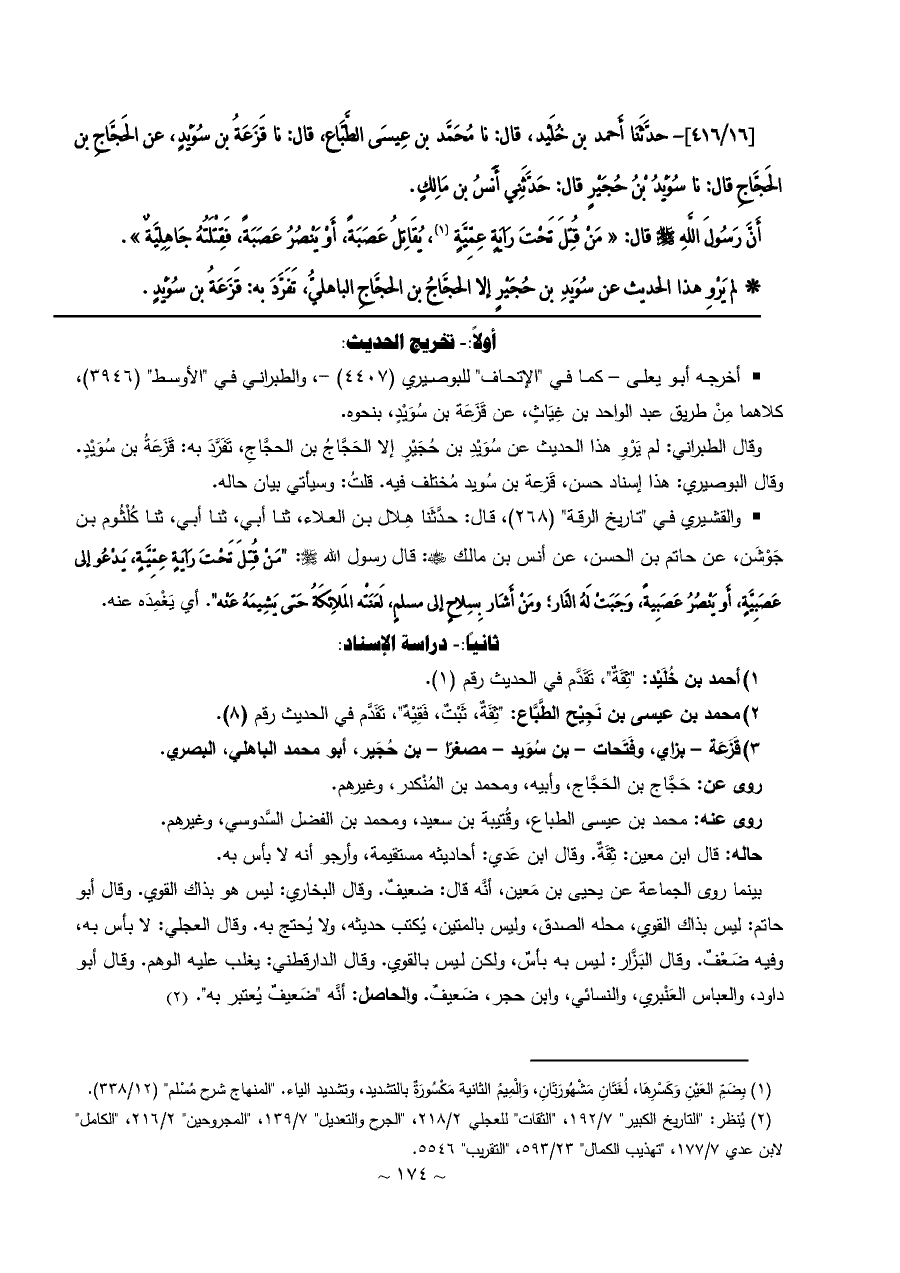 • والقشيري في "تاريخ الرقة" (٢٦٨)، قال: حدَّثَنا هِلال بن العلاء، ثنا أبي، ثنا أبي، ثنا كُلْثُوم بن جَوْشَن، عن حاتم بن الحسن، عن أنس بن مالك - رضي الله عنه -: قال رسول الله - صلى الله عليه وسلم -: "مَنْ قُتِلَ تَحْتَ رَايَةٍ عِمِّيَّةٍ، يَدْعُو إلى عَصَبِيَّةٍ، أَو يَنْصُرُ عَصَبِيةً، وَجَبَتْ لَهُ النَّار؛ ومَنْ أَشَار بِسِلاحٍ إلى مسلمٍ، لَعَنَتْه المَلائِكَةُ حَتى يَشِيمَهُ عَنْه". أي يَغْمِدَه عنه.