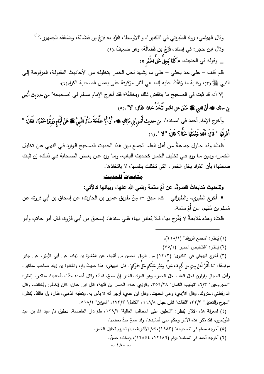 فلم أقف - على حد بحثي - على ما يشهد لحل الخمر بتخليله من الأحاديث المقبولة، المرفوعة إلى النبي - صلى الله عليه وسلم - (¬٣)، وغاية ما وَقَفْتُ عليه إنما هي آثار موْقوفة على بعض الصحابة الكرام (¬٤).
