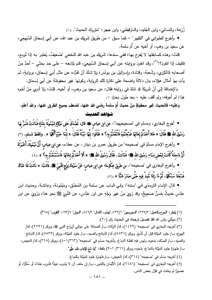 • وأخرج الطبراني في "الكبير" - كما سبق - من طريق شَرِيك بن عبد الله، عن أبي إسحاق السَّبِيعِي، عن سعيد بن وهبٍ، أو أخيه عن أُمّ سلمة.