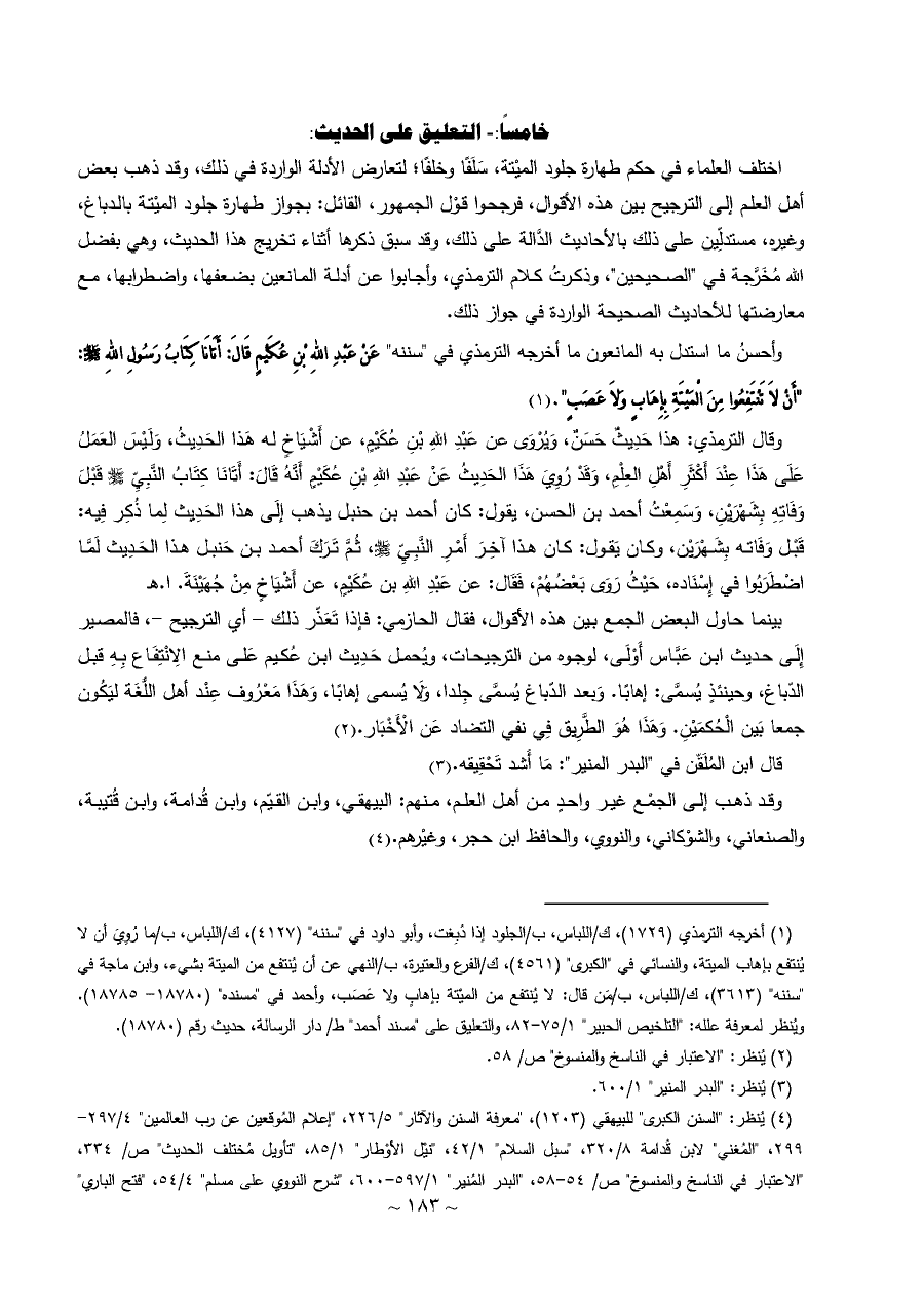 (¬١) أخرجه الترمذي (١٧٢٩)، ك/اللباس، ب/الجلود إذا دُبِغت، وأبو داود في "سننه" (٤١٢٧)، ك/اللباس، ب/ما رُوِيَ أن لا يُنتفع بإهاب الميتة، والنسائي في "الكبرى" (٤٥٦١)، ك/الفرع والعتيرة، ب/النهي عن أن يُنتفع من الميتة بشيء، وابن ماجة في "سننه" (٣٦١٣)، ك/اللباس، ب/مَن قال: لا يُنتفع من الميْتة بإهابٍ ولا عَصَب، وأحمد في "مسنده" (١٨٧٨٠ - ١٨٧٨٥). ويُنظر لمعرفة علله: "التلخيص الحبير" ١/ ٧٥ - ٨٢، والتعليق على "مسند أحمد" ط/ دار الرسالة، حديث رقم (١٨٧٨٠).