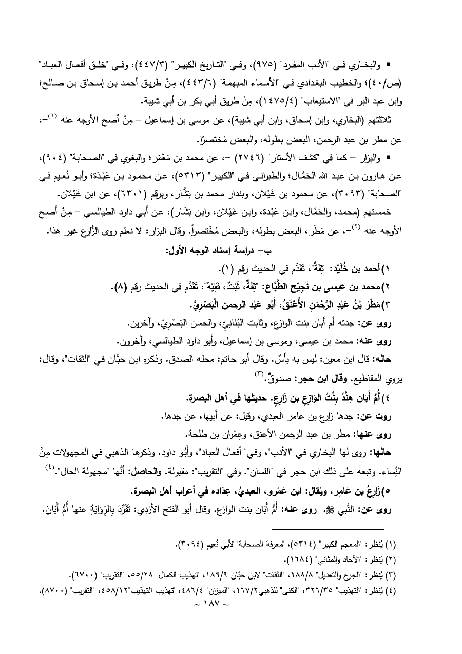 حالها: روى لها البخاري في "الأدب"، وفي" أفعال العباد"، وأَبُو داود. وذكرها الذهبي في المجهولات مِنْ النِّساء. وتبعه على ذلك ابن حجر في "اللسان". وفي "التقريب": مقبولة. والحاصل: أنَّها "مجهولة الحال". (¬٤)