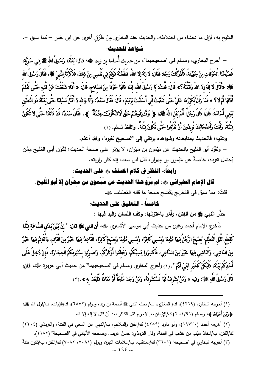 - فأخرج الإمام أحمد وغيره من حديث أبي موسى الأشعري - رضي الله عنه -، أن النبي - صلى الله عليه وسلم - قال: " إِنَّ بَيْنَ يَدَيِ السَّاعَةِ فِتَنًا كَقِطَعِ اللَّيْلِ الْمُظْلِمِ، يُصْبِحُ الرَّجُلُ فِيهَا مُؤْمِنًا وَيُمْسِي كَافِرًا، وَيُمْسِي مُؤْمِنًا وَيُصْبِحُ كَافِرًا، الْقَاعِدُ فِيهَا خَيْرٌ مِنَ الْقَائِمِ، وَالْقَائِمُ فِيهَا خَيْرٌ مِنَ الْمَاشِي، وَالْمَاشِي فِيهَا خَيْرٌ مِنَ السَّاعِي، فَاكْسِرُوا قِسِيَّكُمْ، وَقَطِّعُوا أَوْتَارَكُمْ، وَاضْرِبُوا بِسُيُوفِكُمُ الْحِجَارَةَ، فَإِنْ دُخِلَ عَلَى أَحَدِكُمْ بَيْتَهُ، فَلْيَكُنْ كَخَيْرِ ابْنَيْ آدَمَ ". (¬٢) وأخرج البخاري ومسلم في "صحيحيهما" من حديث أبي هريرة - رضي الله عنه -، قال: قَالَ رَسُولُ اللَّهِ - صلى الله عليه وسلم -: وفيه «وَمَنْ يُشْرِفْ لَهَا تَسْتَشْرِفْهُ، وَمَنْ وَجَدَ مَلْجَأً أَوْ مَعَاذًا فَلْيَعُذْ بِهِ». (¬٣)