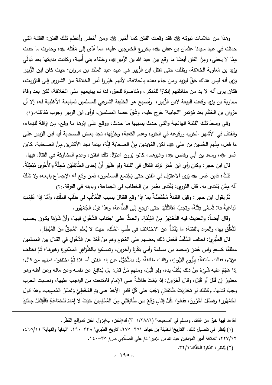 وهذا من علامات نبوته - صلى الله عليه وسلم -، فقد وقعت الفتن كما أخبر - صلى الله عليه وسلم -، ومن أخطر وأعظم تلك الفتن: الفتنة التي حدثت في عهد سيدنا عثمان بن عفان - رضي الله عنه -، بخروج الخارجين عليه، مما أدّى إلى مَقْتله - رضي الله عنه -، وحدوث ما حدث مِمَّا لا يخفى، ومِنْ الفتن أيضًا ما وقع بين عبد الله بن الزُّبير - رضي الله عنه -، وخلفاء بني أُمية، وكانت بدايتها بعد تَوَلّي يزيد بن مُعاوية الخلافة، وظلت حتى مَقتل ابن الزُّبير في عهد عبد الملك بن مروان؛ حيث كان ابن الزُّبير يَرَى أنه ليس هناك حَقٌ ليزيد ومن جاء بعده بالخلافة، لأنهم غَيّروا أمر الخلافة من الشورى إلى التَوْريث، فكان يرى أنه لا بد من مقاتلتهم إنكارًا للمُنكر، ومُناصرة للحق، لذا لم يبايعهم على الخلافة، لكن بعد وفاة معاوية بن يزيد وقعت البيعة لابن الزُّبير، وأصبح هو الخليفة الشرعي للمسلمين لمبايعة الأغلبية له، إلا أن مَرْوان بن الحَكَم بعد مُؤتمر "الجابية" خَرَج عليه، وشَقّ عصا المسلمين، فرأى ابن الزبير وجوب مُقاتلته. (¬١)