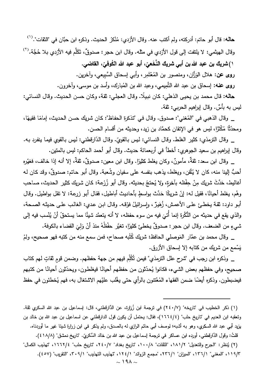 (¬٢) يُنظر: "الجرح والتعديل" ٢/ ١٨١، "الثقات" ٨/ ١٠٠، "تاريخ بغداد" ٧/ ٢٤٠، "تاريخ حلب" ٤/ ١٦٦٢، "تهذيب الكمال" ٣/ ١١٩، "المغني" ١/ ١٣٦، "الميزان" ١/ ٢٣٦، "مجمع الزوائد" ١/ ١٢٤، "تهذيب التهذيب" ١/ ٣٠٩، "التقريب" (٤٥٧).