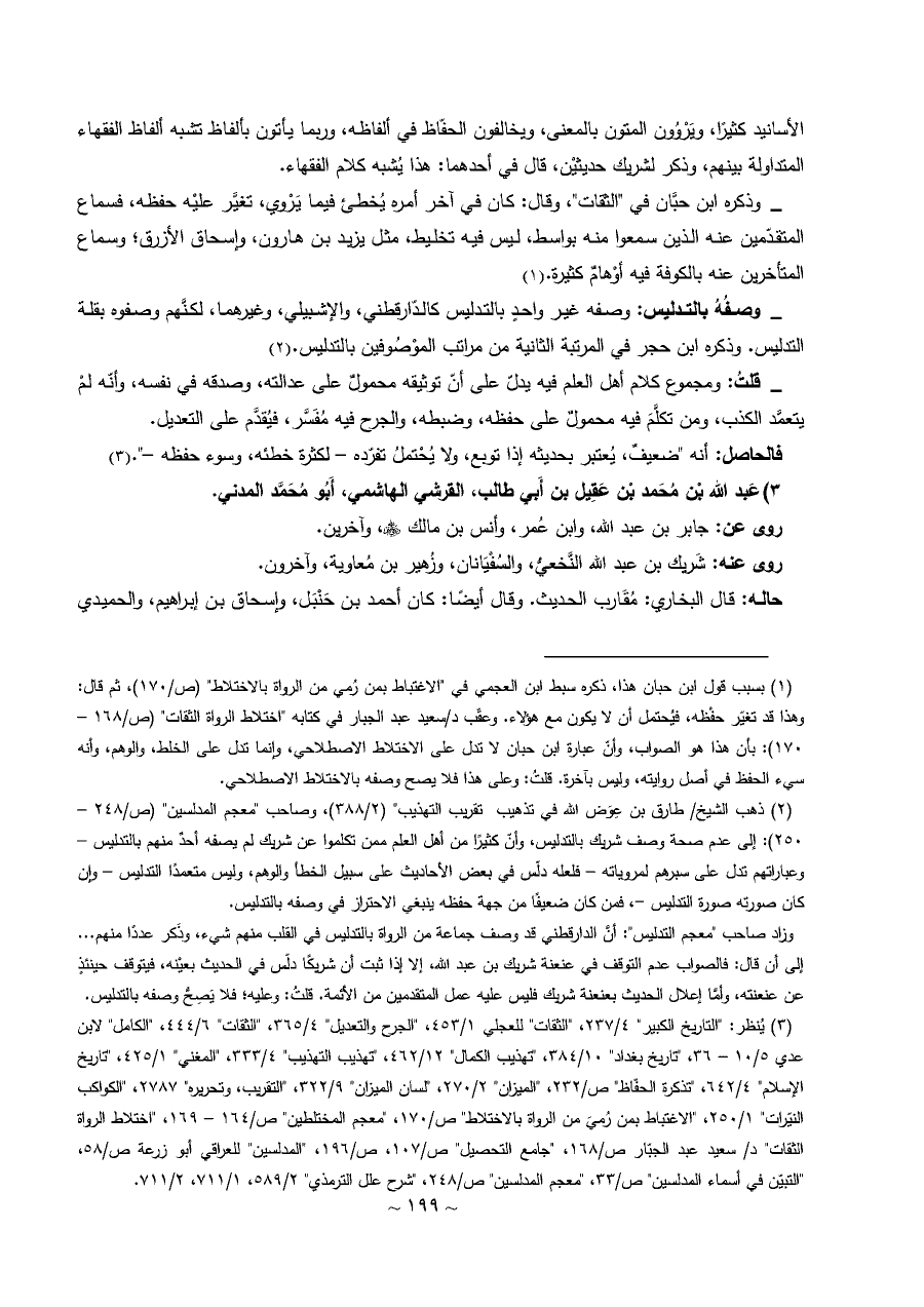 (¬٢) ذهب الشيخ/ طارق بن عِوَض الله في تذهيب تقريب التهذيب" (٢/ ٣٨٨)، وصاحب "معجم المدلسين" (ص/٢٤٨ - ٢٥٠): إلى عدم صحة وصف شريك بالتدليس، وأنّ كثيرًا من أهل العلم ممن تكلموا عن شريك لم يصفه أحدٌ منهم بالتدليس - وعباراتهم تدل على سبرهم لمروياته - فلعله دلّس في بعض الأحاديث على سبيل الخطأ والوهم، وليس متعمدًا التدليس - وإن كان صورته صورة التدليس -، فمن كان ضعيفًا من جهة حفظه ينبغي الاحتراز في وصفه بالتدليس.