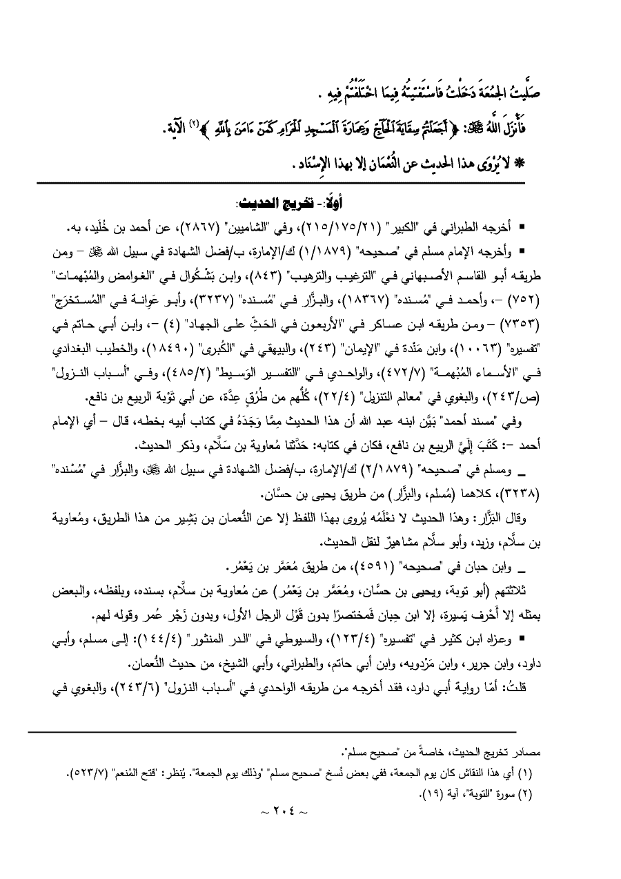 • وعزاه ابن كثير في "تفسيره" (٤/ ١٢٣)، والسيوطي في "الدر المنثور" (٤/ ١٤٤): إلى مسلم، وأبي داود، وابن جرير، وابن مَرْدويه، وابن أبي حاتم، والطبراني، وأبي الشيخ، من حديث النُّعمان.