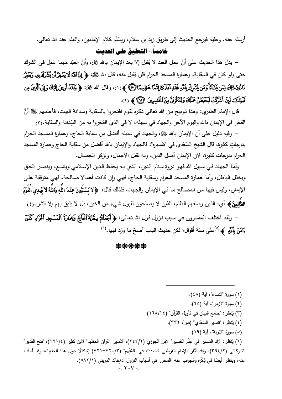 - ولقد اختلف المفسرون في سبب نزول قول الله تعالى: {أَجَعَلْتُمْ سِقَايَةَ الْحَاجِّ وَعِمَارَةَ الْمَسْجِدِ الْحَرَامِ كَمَنْ آمَنَ بِاللَّهِ} (¬٥) على ستة أقوال؛ لكن حديث الباب أصحّ ما وَرَد فيها. (¬٦)