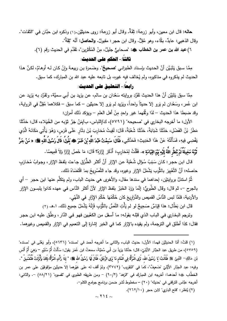 ثُمَّ استدلَّ بروايتيْن، إحداهما في سندها مقال، والأخرى هي حديث الباب، ولم يتكلَّم عنها ابن حجر - أي بالجرح -، ثم قال: وقال الطَّبريُّ: إنَّما وَرَدَ الخَبَرُ بلفظ الإزار لأنَّ أكثر النَّاس في عهده كانوا يلبسون الإزار والأردية، فلمَّا لبس النَّاسُ القميص والدَّرَارِيعَ كان حُكْمُهَا حُكْمَ الإِزَارِ في النَّهْيِ.