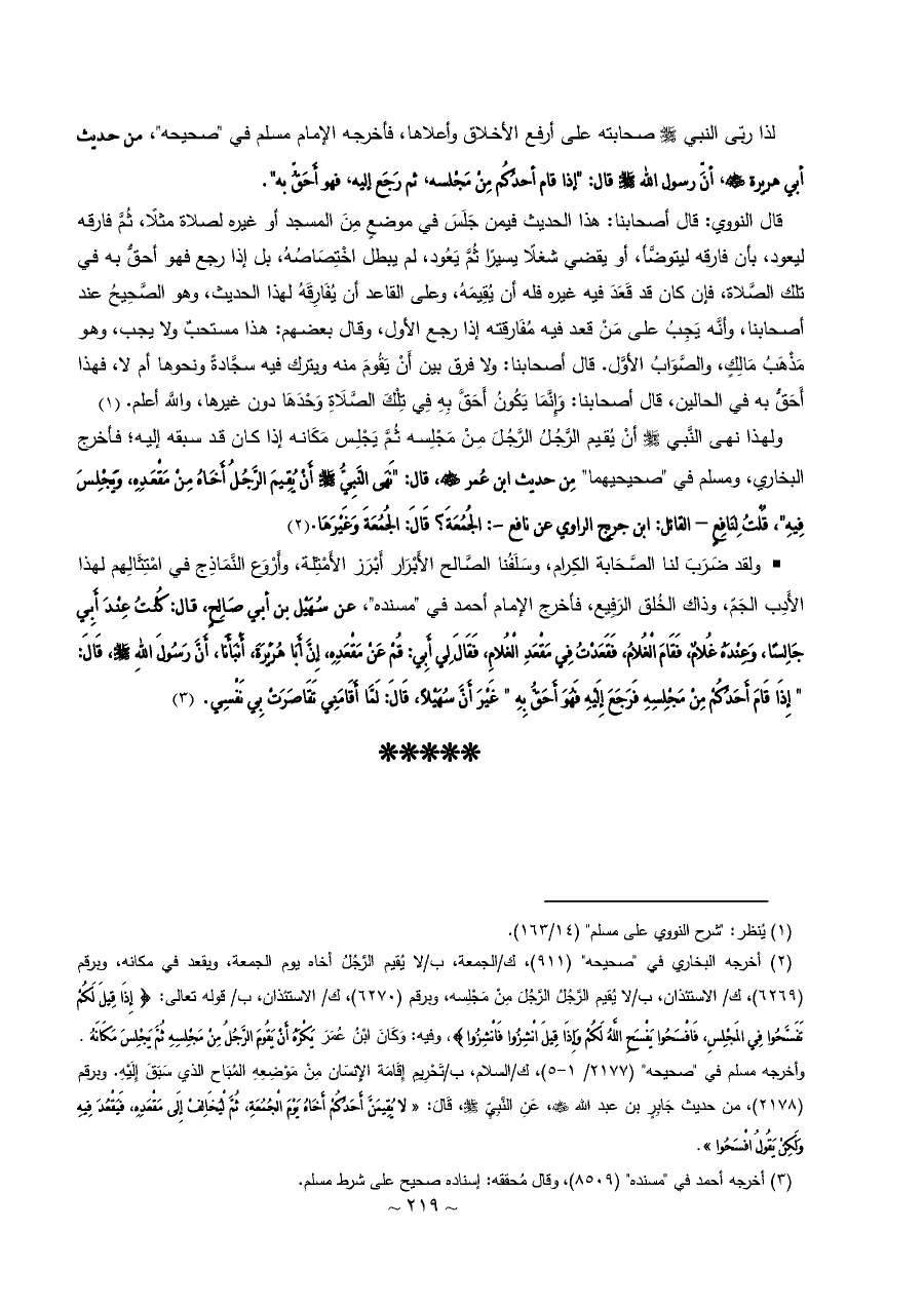 لذا ربّى النبي - صلى الله عليه وسلم - صحابته على أرفع الأخلاق وأعلاها، فأخرجه الإمام مسلم في "صحيحه"، من حديث أبي هريرة - رضي الله عنه -، أنَّ رسول الله - صلى الله عليه وسلم - قال: "إذا قام أحدُكُم مِنْ مَجْلسه، ثم رَجَع إليه، فهو أَحَقُّ به".