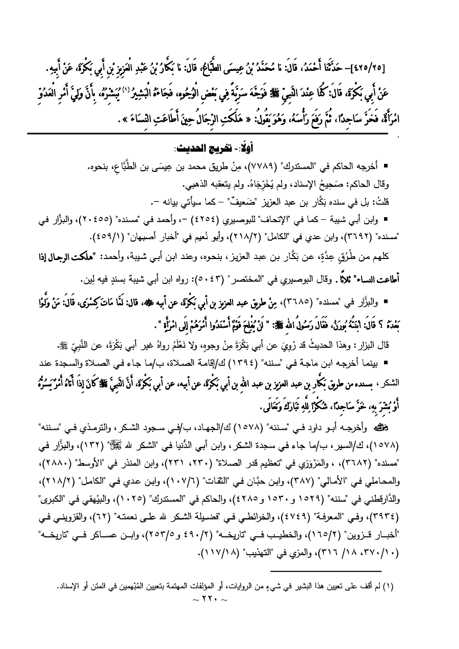 • بينما أخرجه ابن ماجة في "سننه" (١٣٩٤) ك/إقامة الصلاة، ب/ما جاء في الصلاة والسجدة عند الشكر، بسنده من طريق بَكَّارِ بن عبد العزيز بن عبد اللهِ بن أبي بَكْرَةَ، عن أبيه، عن أبي بَكْرَةَ، أَنَّ النَّبِيَّ - صلى الله عليه وسلم - كَانَ إِذَا أَتَاهُ أَمْرٌ يَسُرُّهُ أَوْ بُشِّرَ بِهِ، خَرَّ سَاجِدًا، شُكْرًا لِلَّهِ تَبَارَكَ وَتَعَالَى.