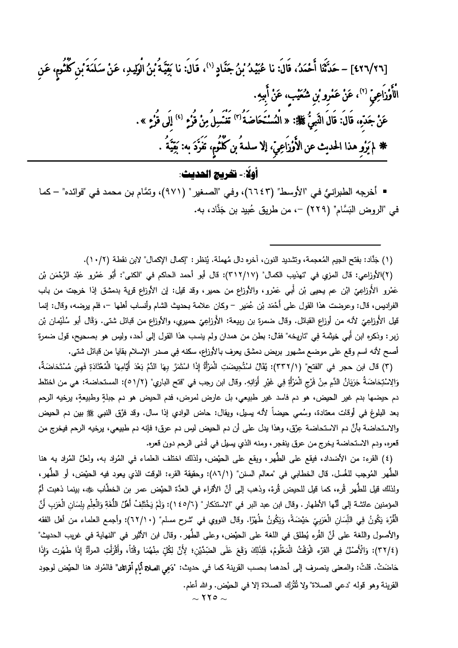[٢٦/ ٤٢٦]- حَدَّثَنَا أَحْمَدُ، قَالَ: نا عُبَيْدُ بْنُ جَنَّادٍ (¬١)، قَالَ: نا بَقِيَّةُ بْنُ الْوَلِيدِ، عَنْ سَلَمَةَ بْنِ كُلْثُومٍ، عَنِ الْأَوْزَاعِيِّ (¬٢)، عَنْ عَمْرِو بْنِ شُعَيْبٍ، عَنْ أَبِيهِ.