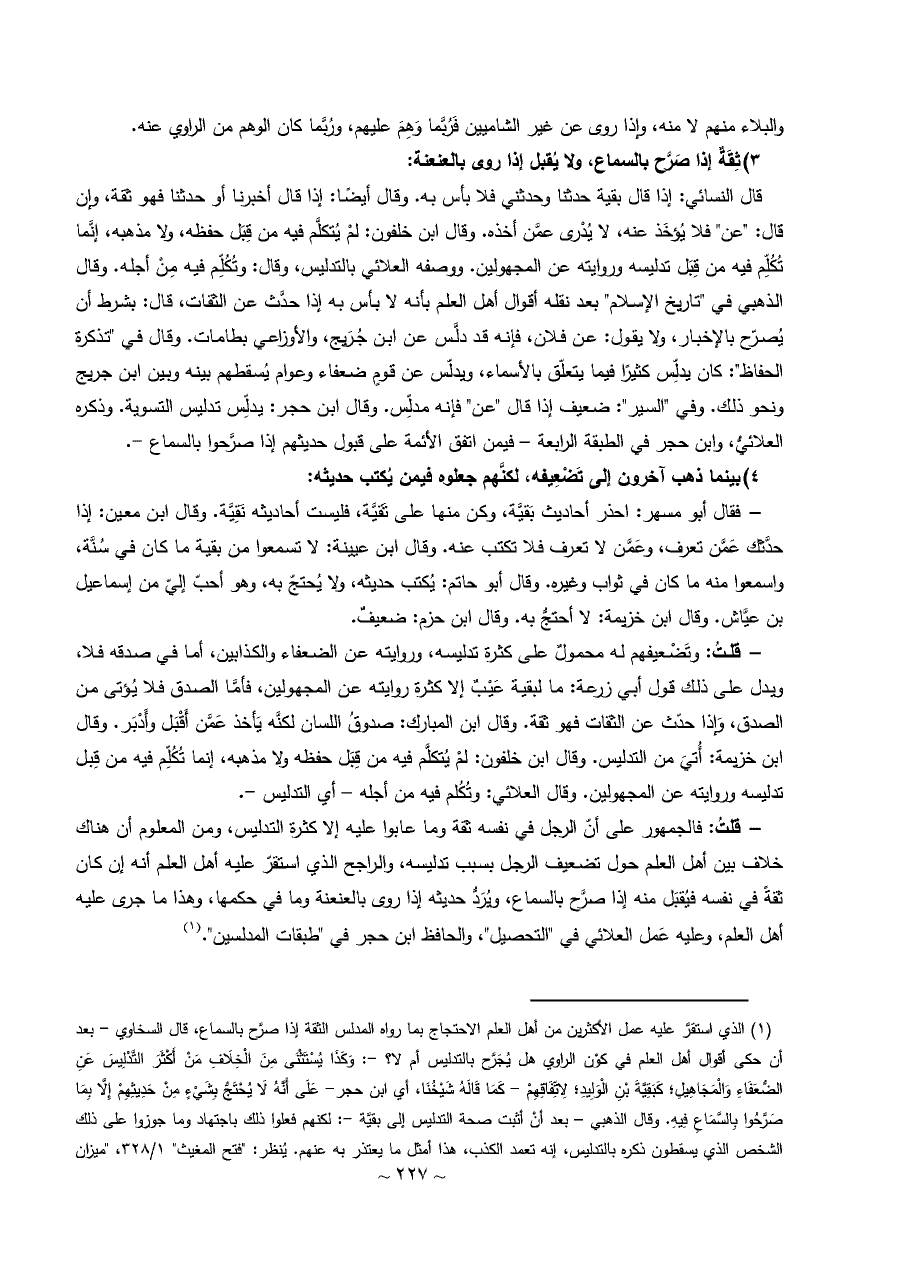 (¬١) الذي استقرَّ عليه عمل الأكثرين من أهل العلم الاحتجاج بما رواه المدلس الثقة إذا صرَّح بالسماع، قال السخاوي - بعد أن حكى أقوال أهل العلم في كوْن الراوي هل يُجَرَّح بالتدليس أم لا؟ -: وَكَذَا يُسْتَثْنَى مِنَ الْخِلَافِ مَنْ أَكْثَرَ التَّدْلِيسَ عَنِ الضُّعَفَاءِ وَالْمَجَاهِيلِ; كَبَقِيَّةَ بْنِ الْوَلِيدِ; لِاتِّفَاقِهِمْ - كَمَا قَالَهُ شَيْخُنَا، أي ابن حجر- عَلَى أَنَّهُ لَا يُحْتَجُّ بِشَيْءٍ مِنْ حَدِيثِهِمْ إِلَّا بِمَا صَرَّحُوا بِالسَّمَاعِ فِيهِ. وقال الذهبي - بعد أنْ أثبت صحة التدليس إلى بقيَّة -: لكنهم فعلوا ذلك باجتهاد وما جوزوا على ذلك الشخص الذي يسقطون ذكره بالتدليس، إنه تعمد الكذب، هذا أمثل ما يعتذر به عنهم. يُنظر: "فتح المغيث" ١/ ٣٢٨، "ميزان الاعتدال" ١/ ٣٣٩، "جامع التحصيل" (ص/١٠٠)، "النكت" للزركشي ٢/ ٨٦، "تدريب الراوي" ١/ ٣٦١.