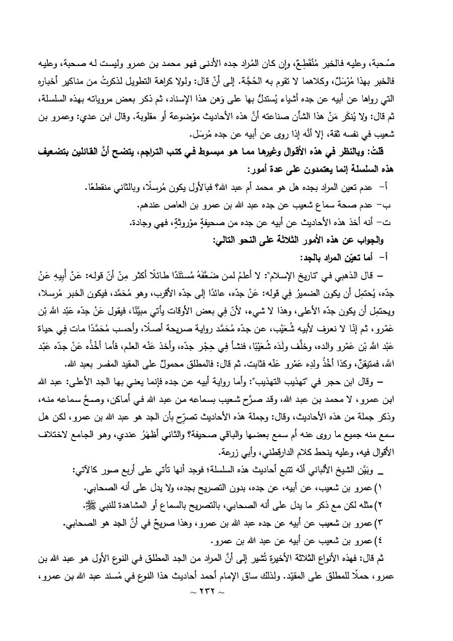 صُحبة، وعليه فالخبر مُنْقَطِعٌ، وإن كان المُراد جده الأدنى فهو محمد بن عمرو وليست له صحبة، وعليه فالخبر بهذا مُرْسَلٌ، وكلاهما لا تقوم به الحُجَّة. إلى أنْ قال: ولولا كراهة التطويل لذكرتُ من مناكير أخباره التي رواها عن أبيه عن جده أشياء يُستدلُّ بها على وَهن هذا الإسناد، ثم ذكر بعض مروياته بهذه السلسلة، ثم قال: ولا يُنكَر مَنْ هذا الشأن صناعته أنَّ هذه الأحاديث موْضوعة أو مقلوبة. وقال ابن عدي: وعمرو بن شعيب في نفسه ثقة، إلا أنَّه إذا روى عن أبيه عن جده مُرسَل.