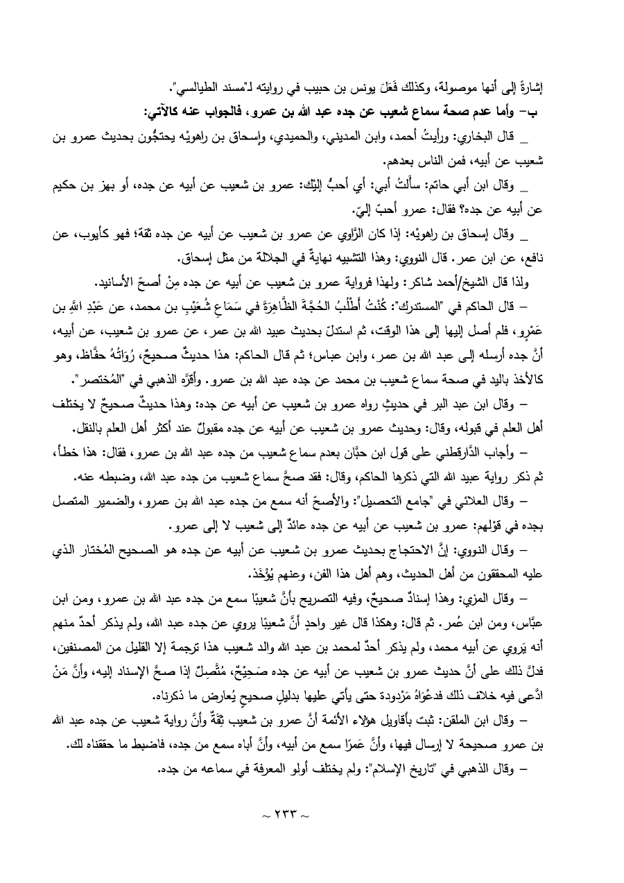 - وقال العلائي في "جامع التحصيل": والأصحّ أنه سمع من جده عبد الله بن عمرو، والضمير المتصل بجده في قوْلهم: عمرو بن شعيب عن أبيه عن جده عائدٌ إلى شعيب لا إلى عمرو.