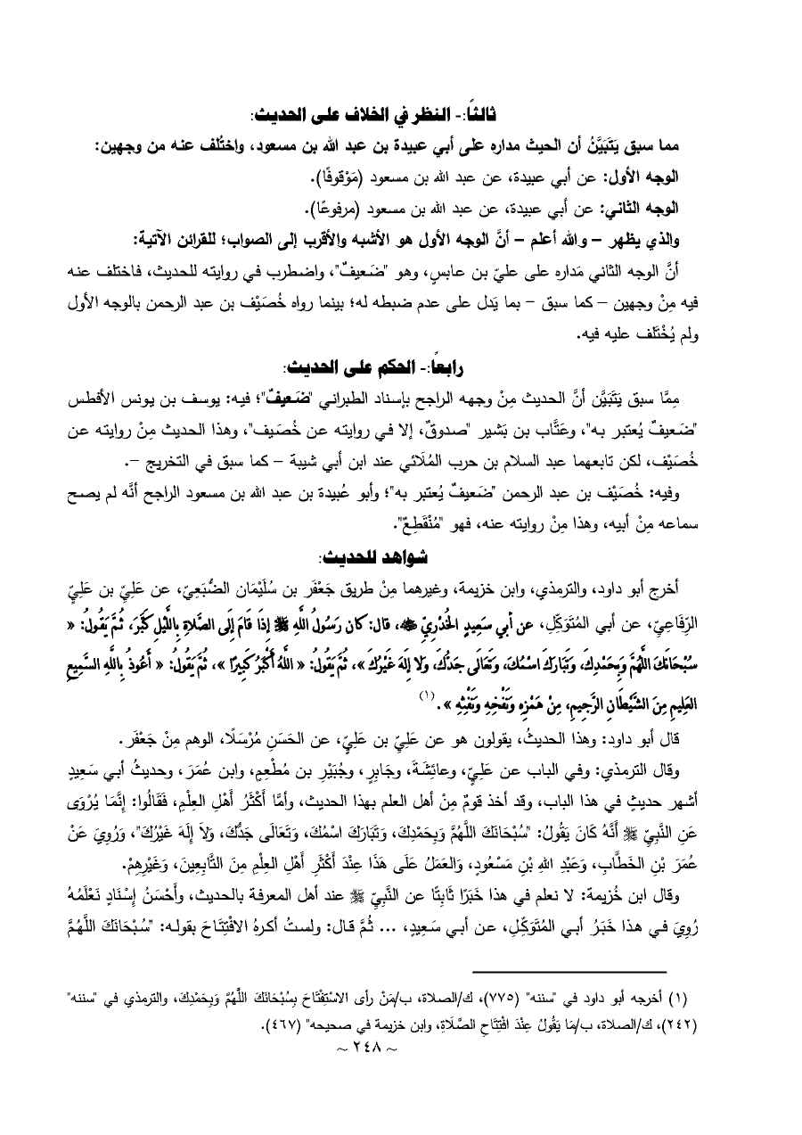 أخرج أبو داود، والترمذي، وابن خزيمة، وغيرهما مِنْ طريق جَعْفَر بن سُلَيْمَان الضُّبَعِيّ، عن عَلِيِّ بن عَلِيٍّ الرِّفَاعِيِّ، عن أبي المُتَوَكِّلِ، عن أبي سَعِيدٍ الخُدْرِيِّ - رضي الله عنه -، قال: كان رَسُولُ اللَّهِ - صلى الله عليه وسلم - إِذَا قَامَ إِلَى الصَّلاةِ بِاللَّيْلِ كَبَّرَ، ثُمَّ يَقُولُ: «سُبْحَانَكَ اللَّهُمَّ وَبِحَمْدِكَ، وَتَبَارَكَ اسْمُكَ، وَتَعَالَى جَدُّكَ، وَلا إِلَهَ غَيْرُكَ»، ثُمَّ يَقُولُ: «اللَّهُ أَكْبَرُ كَبِيرًا»، ثُمَّ يَقُولُ: «أَعُوذُ بِاللَّهِ السَّمِيعِ العَلِيمِ مِنَ الشَّيْطَانِ الرَّجِيمِ، مِنْ هَمْزِهِ وَنَفْخِهِ وَنَفْثِهِ». (¬١)