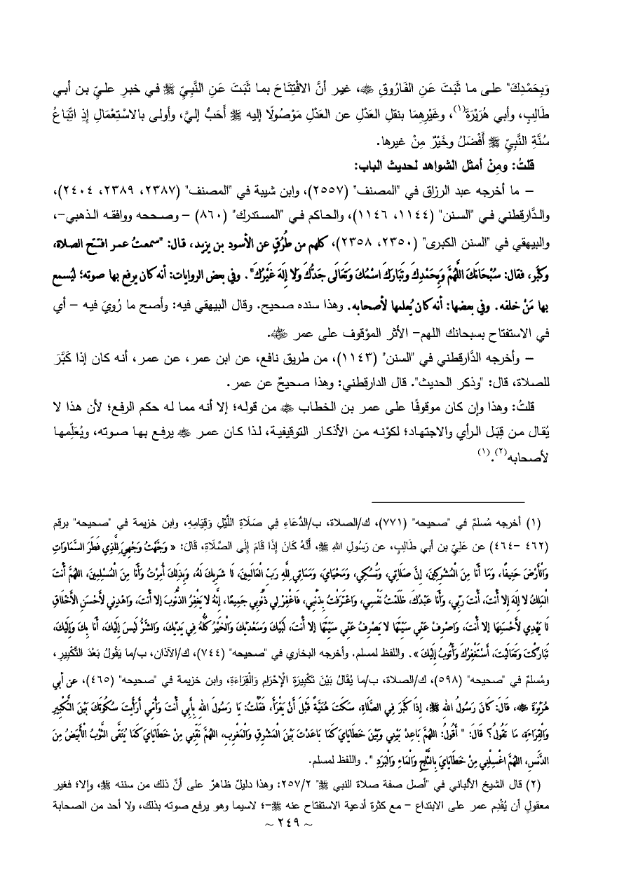 (¬٢) قال الشيخ الألباني في "أصل صفة صلاة النبي - صلى الله عليه وسلم - " ٢/ ٢٥٧: وهذا دليلٌ ظاهرٌ على أنَّ ذلك من سننه - صلى الله عليه وسلم -، وإلا؛ فغير معقولٍ أن يُقْدِم عمر على الابتداع - مع كثرة أدعية الاستفتاح عنه - صلى الله عليه وسلم -؛ لاسيما وهو يرفع صوته بذلك، ولا أحد من الصحابة ينكر ذلك عليه، وهذا بَيِّنٌ لا يخفى. والحمد لله.