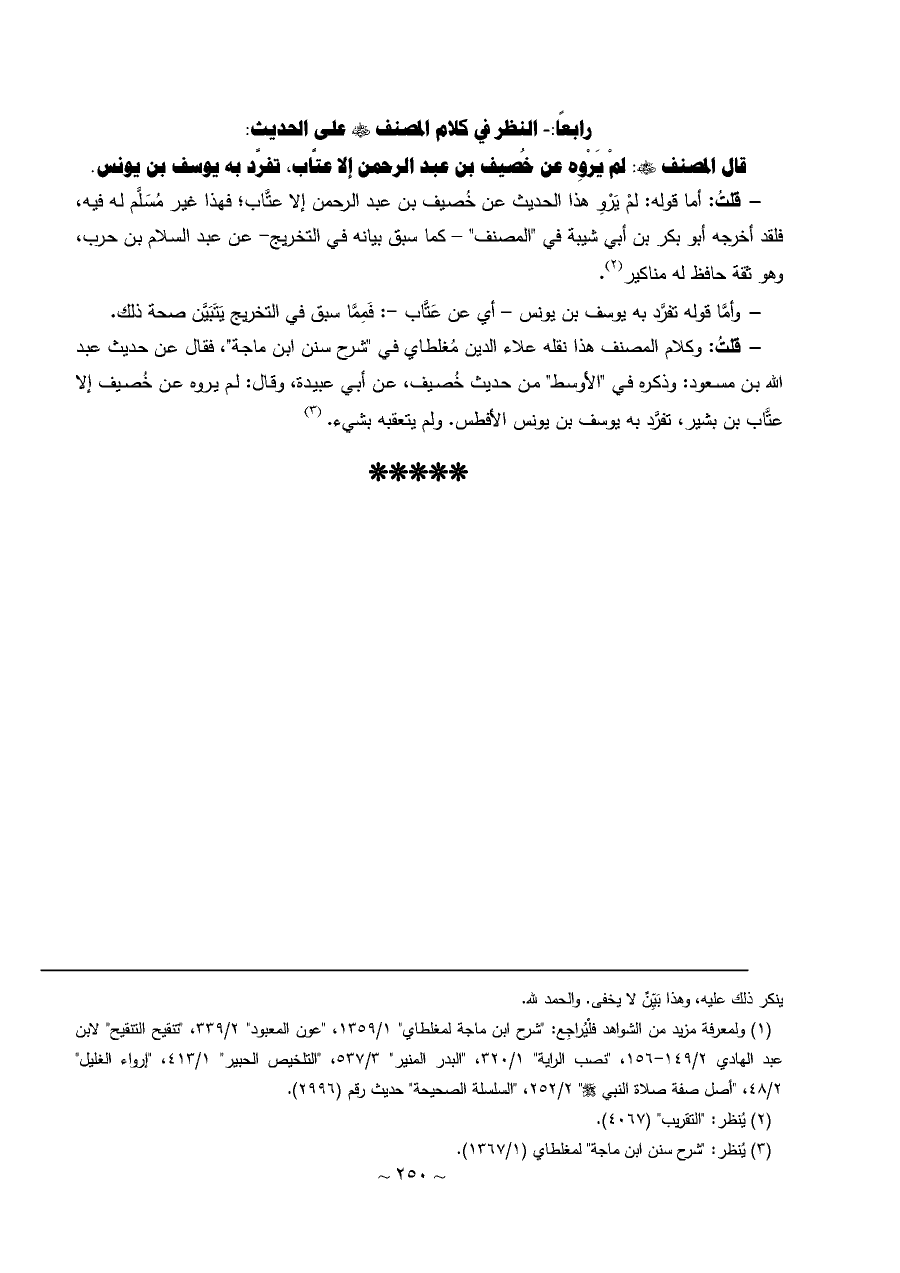 - قلتُ: وكلام المصنف هذا نقله علاء الدين مُغلطاي في "شرح سنن ابن ماجة"، فقال عن حديث عبد الله بن مسعود: وذكره في "الأوسط" من حديث خُصيف، عن أبي عبيدة، وقال: لم يروه عن خُصيف إلا عتَّاب بن بشير، تفرَّد به يوسف بن يونس الأفطس. ولم يتعقبه بشيء. (¬٢)