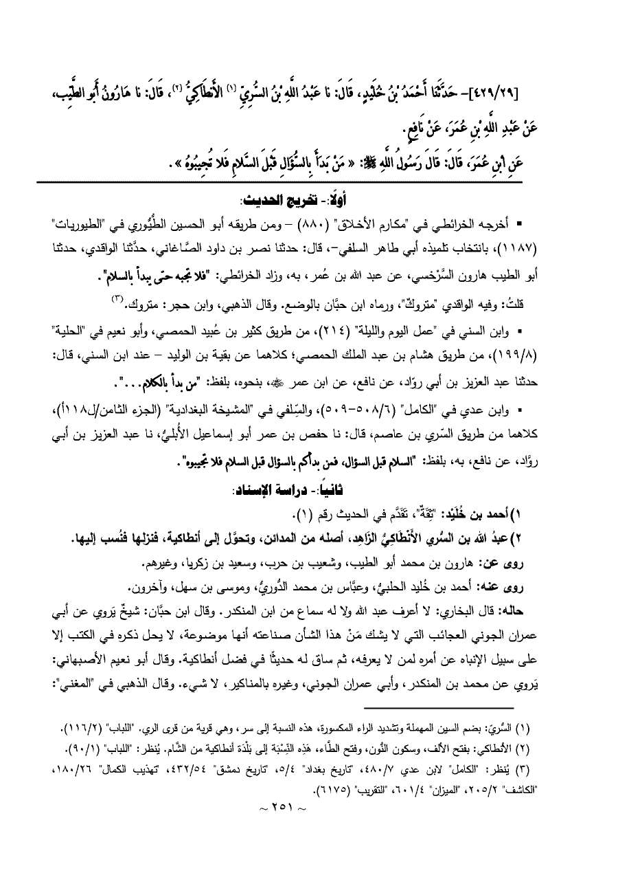 [٢٩/ ٤٢٩]- حَدَّثَنَا أَحْمَدُ بْنُ خُلَيْدٍ، قَالَ: نا عَبْدُ اللَّهِ بْنُ السُّرِيِّ (¬١) الأَنطَاكِيُّ (¬٢)، قَالَ: نا هَارُونُ أَبُو الطَّيِّب، عَنْ عَبْدِ اللَّهِ بْنِ عُمَرَ، عَنْ نَافِعٍ.