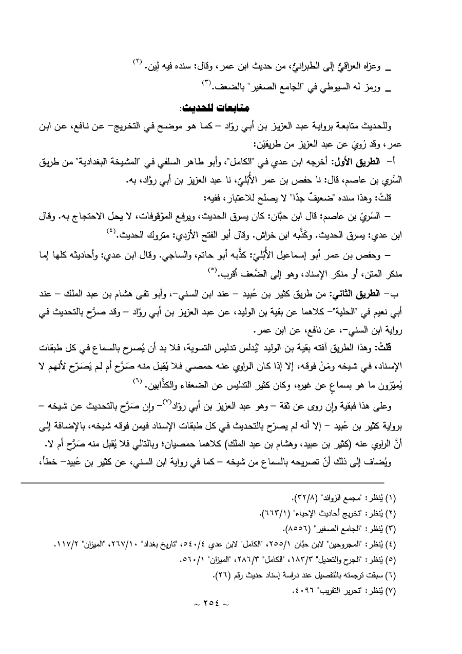 وللحديث متابعة برواية عبد العزيز بن أبي روّاد - كما هو موضح في التخريج- عن نافع، عن ابن عمر، وقد رُويَ عن عبد العزيز من طريقيْن: