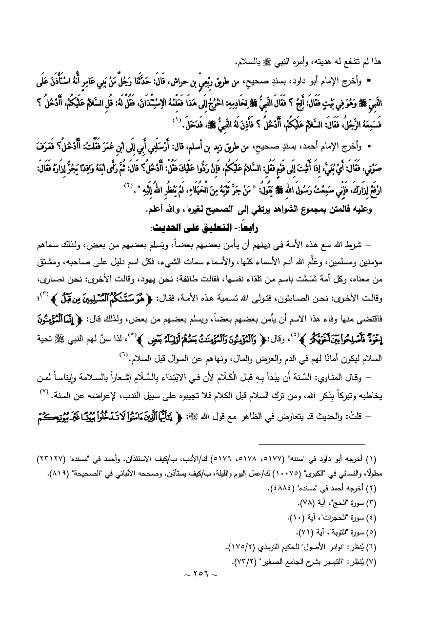 • وأخرج الإمام أبو داود، بسندٍ صحيحٍ، من طريق رِبْعِيٍّ بن حراش، قَالَ: حَدَّثَنَا رَجُلٌ مَنْ بَنِي عَامِرٍ أَنَّهُ اسْتَأْذَنَ عَلَى النَّبِيِّ - صلى الله عليه وسلم - وَهُوَ فِي بَيْتٍ فَقَالَ: أَلِجُ؟ فَقَالَ النَّبِيُّ - صلى الله عليه وسلم - لِخَادِمِهِ: اخْرُجْ إِلَى هَذَا فَعَلِّمْهُ الاِسْتِئْذَانَ، فَقُلْ لَهُ: قُلِ السَّلَامُ عَلَيْكُمْ، أَأَدْخُلُ؟ فَسَمِعَهُ الرَّجُلُ، فَقَالَ: السَّلَامُ عَلَيْكُمْ، أَأَدْخُلُ؟ فَأَذِنَ لَهُ النَّبِيُّ - صلى الله عليه وسلم -، فَدَخَلَ. (¬١)