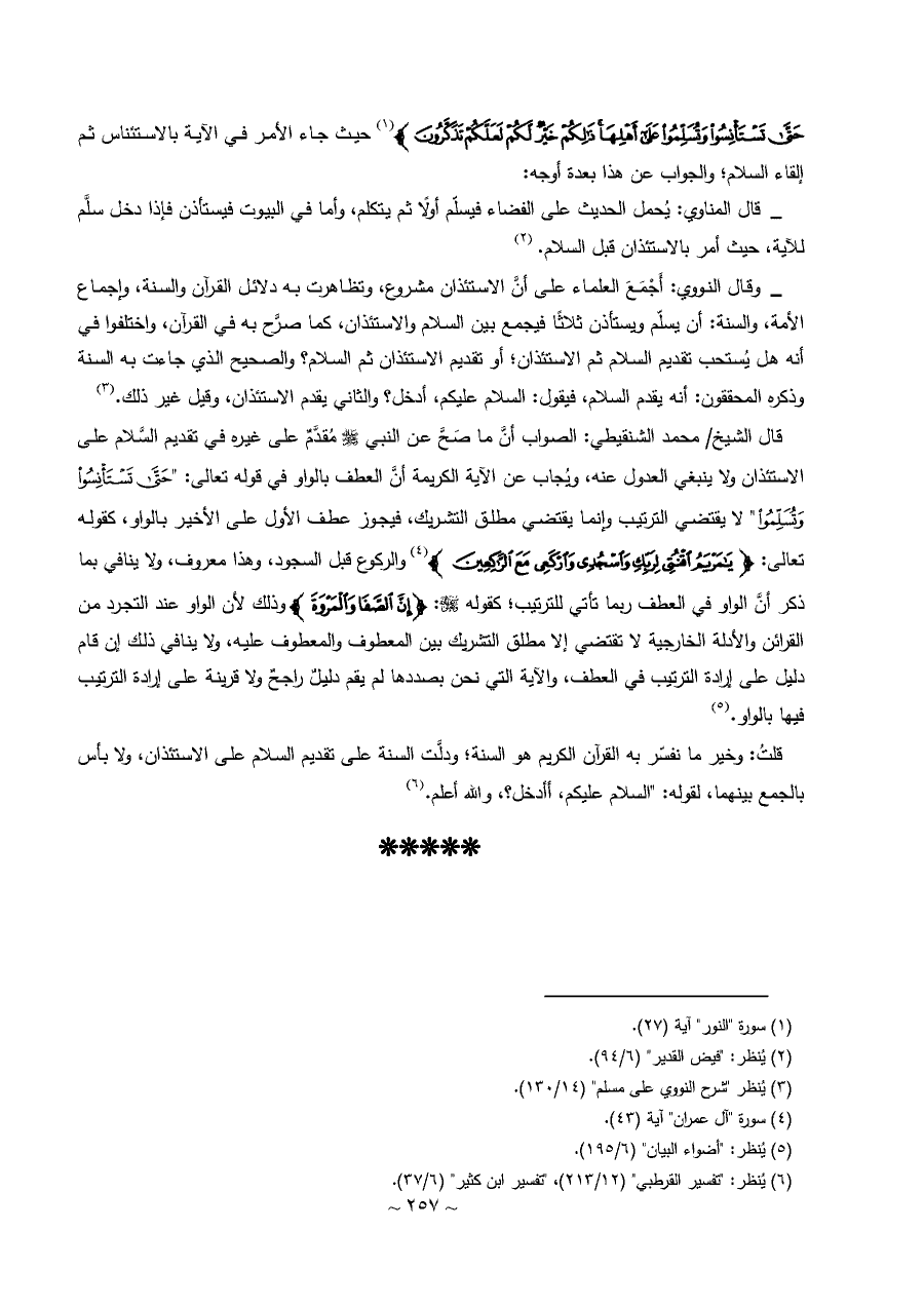 قال الشيخ/ محمد الشنقيطي: الصواب أنَّ ما صَحَّ عن النبي - صلى الله عليه وسلم - مُقدَّمٌ على غيره في تقديم السَّلام على الاستئذان ولا ينبغي العدول عنه، ويُجاب عن الآية الكريمة أنَّ العطف بالواو في قوله تعالى: " حَتَّى تَسْتَأْنِسُوا وَتُسَلِّمُوا " لا يقتضي الترتيب وإنما يقتضي مطلق التشريك، فيجوز عطف الأول على الأخير بالواو، كقوله تعالى: {يَامَرْيَمُ اقْنُتِي لِرَبِّكِ وَاسْجُدِي وَارْكَعِي مَعَ الرَّاكِعِينَ} (¬٤) والركوع قبل السجود، وهذا معروف، ولا ينافي بما ذكر أنَّ الواو في العطف ربما تأتي للترتيب؛ كقوله - سبحانه وتعالى -: {إِنَّ الصَّفَا وَالْمَرْوَةَ} وذلك لأن الواو عند التجرد من القرائن والأدلة الخارجية لا تقتضي إلا مطلق التشريك بين المعطوف والمعطوف عليه، ولا ينافي ذلك إن قام دليل على إرادة الترتيب في العطف، والآية التي نحن بصددها لم يقم دليلٌ راجحٌ ولا قرينة على إرادة الترتيب فيها بالواو. (¬٥)