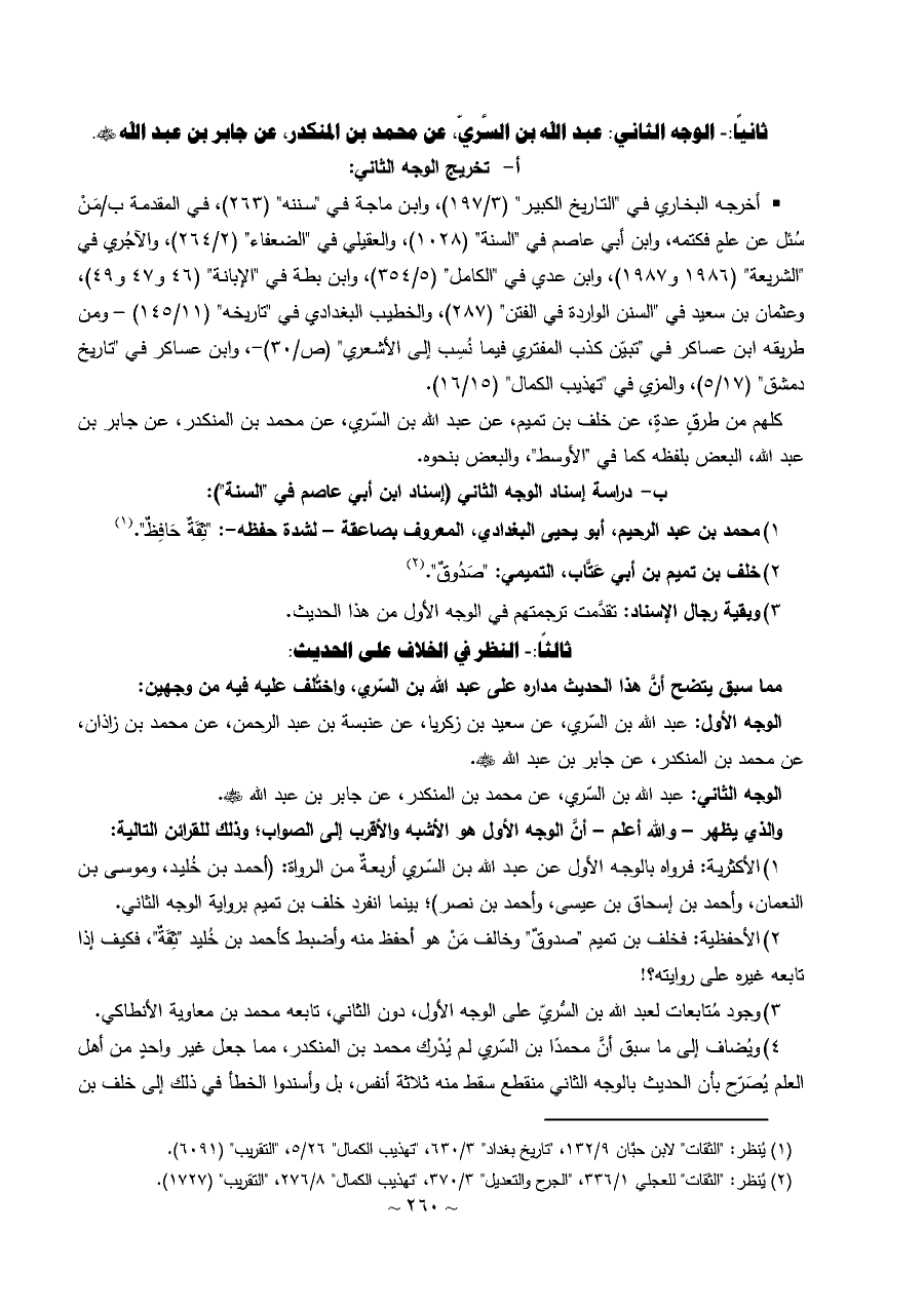 ١) الأكثرية: فرواه بالوجه الأول عن عبد الله بن السّري أربعةٌ من الرواة: (أحمد بن خُليد، وموسى بن النعمان، وأحمد بن إسحاق بن عيسى، وأحمد بن نصر)؛ بينما انفرد خلف بن تميم برواية الوجه الثاني.