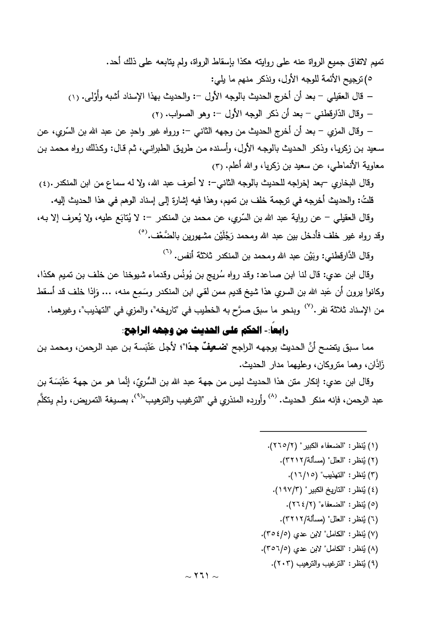 وقال ابن عدي: إنكار متن هذا الحديث ليس من جهة عبد الله بن السُّريّ، إنَّما هو من جهة عَنْبَسَة بن عبد الرحمن، فإنه منكر الحديث. (¬٨) وأورده المنذري في "الترغيب والترهيب" (¬٩)، بصيغة التمريض، ولم يتكلَّم