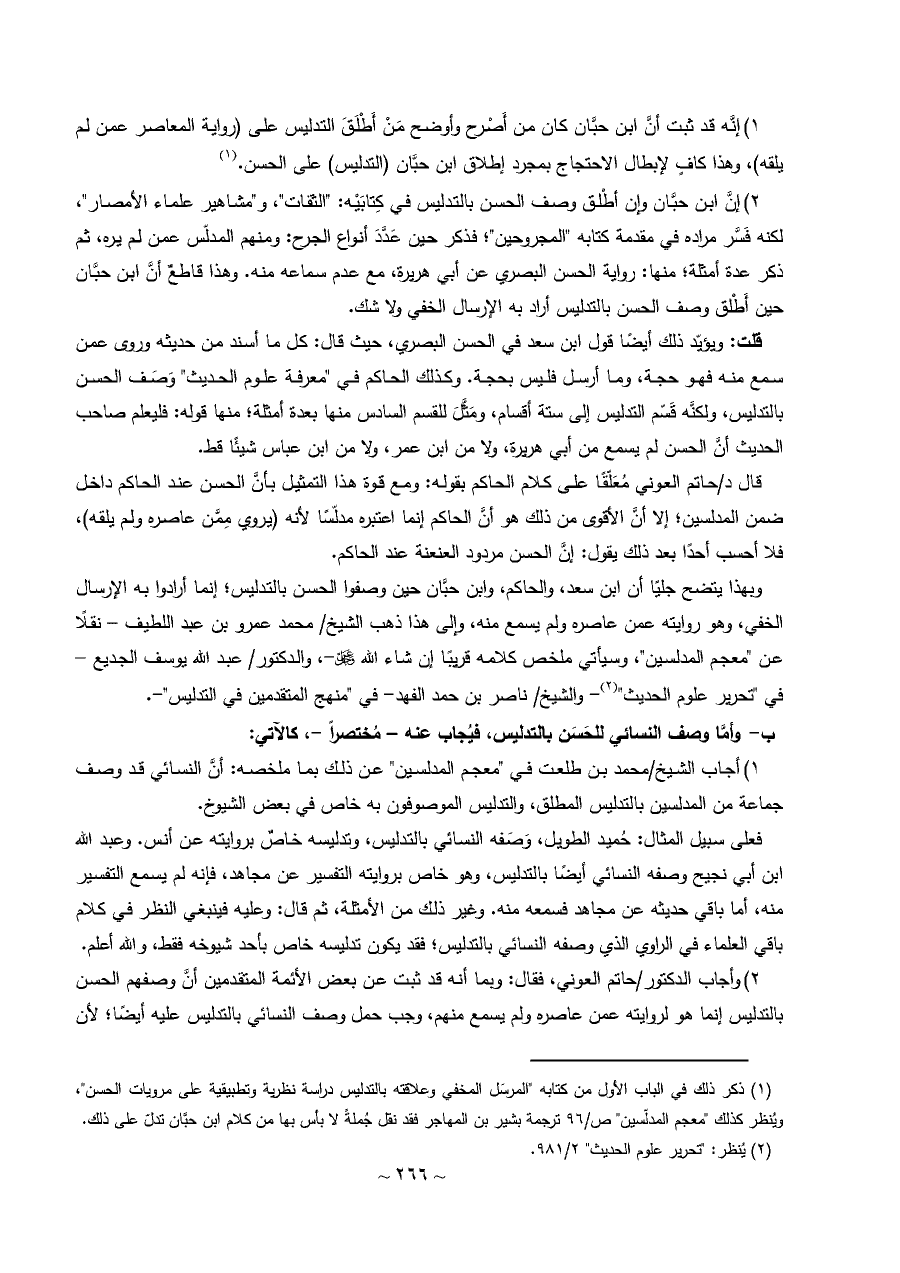 (¬١) ذكر ذلك في الباب الأول من كتابه "المرسَل المخفي وعلاقته بالتدليس دراسة نظرية وتطبيقية على مرويات الحسن"، ويُنظر كذلك "معجم المدلّسين" ص/٩٦ ترجمة بشير بن المهاجر فقد نقل جُملةً لا بأس بها من كلام ابن حبَّان تدلّ على ذلك.