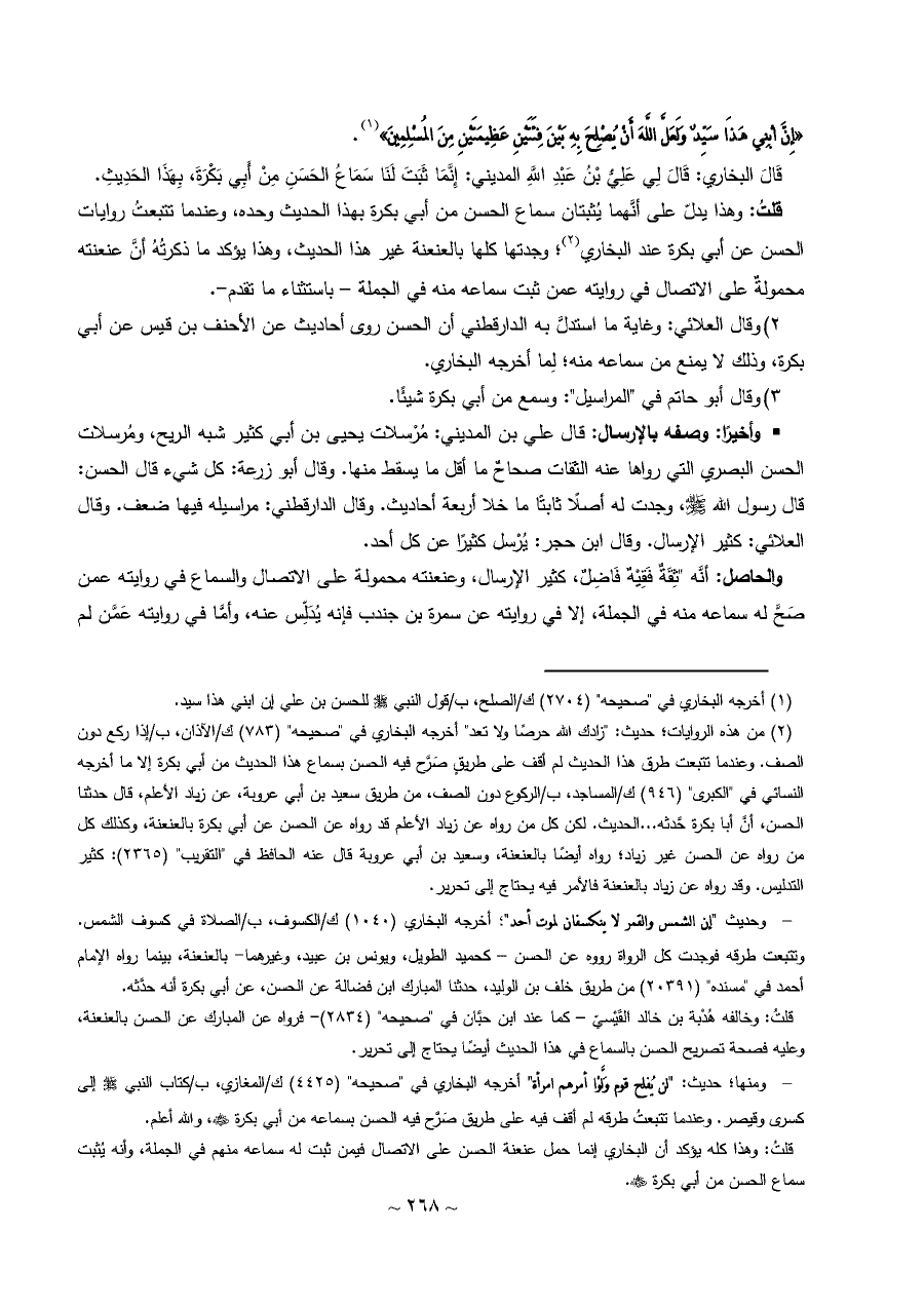 ٢) وقال العلائي: وغاية ما استدلَّ به الدارقطني أن الحسن روى أحاديث عن الأحنف بن قيس عن أبي بكرة، وذلك لا يمنع من سماعه منه؛ لِما أخرجه البخاري.