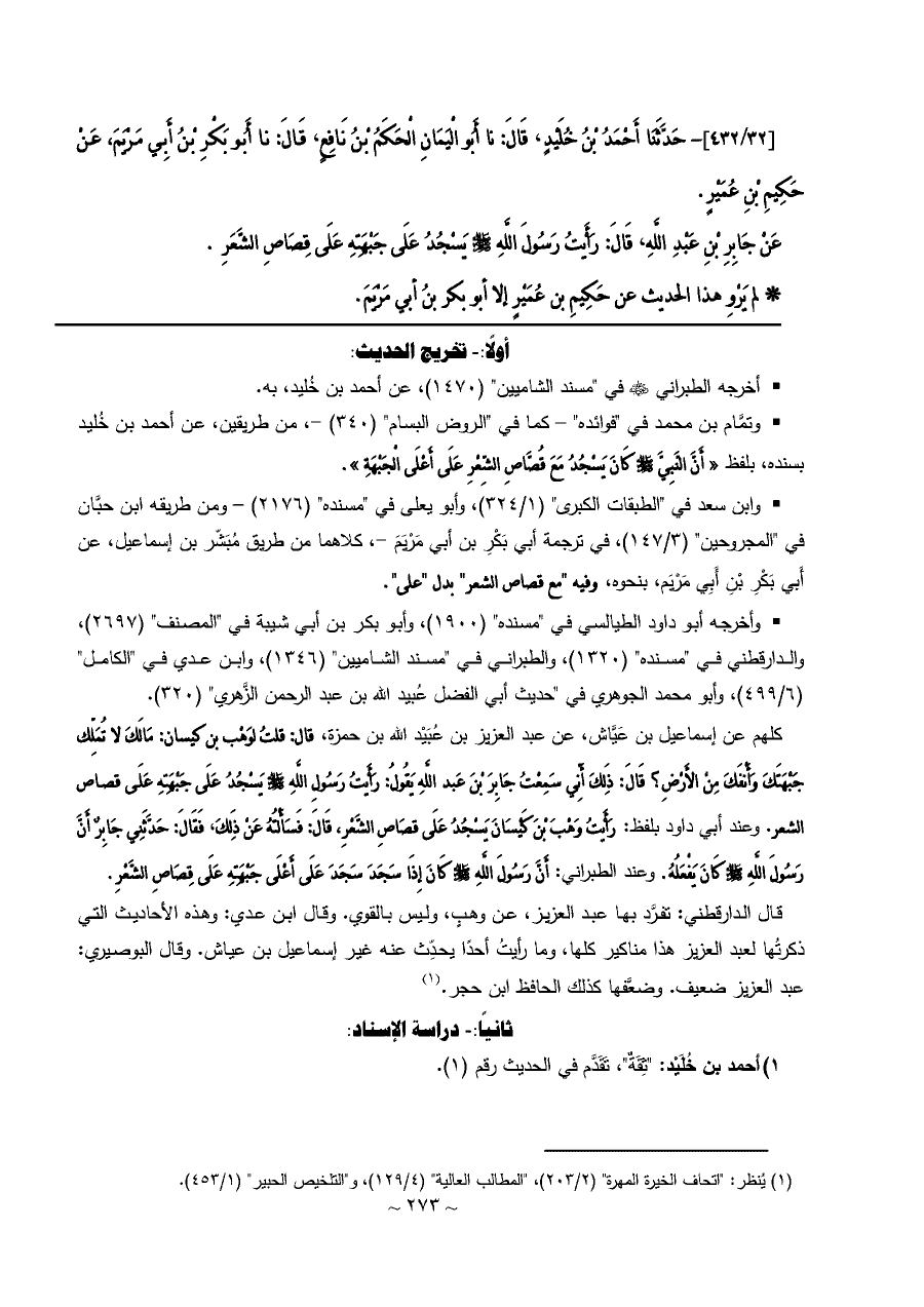 [٣٢/ ٤٣٢]- حَدَّثَنَا أَحْمَدُ بْنُ خُلَيْدٍ، قَالَ: نا أَبُو الْيَمَانِ الْحَكَمُ بْنُ نَافِعٍ، قَالَ: نا أَبُو بَكْرِ بْنُ أَبِي مَرْيَمَ، عَنْ حَكِيمِ بْنِ عُمَيْرٍ.
