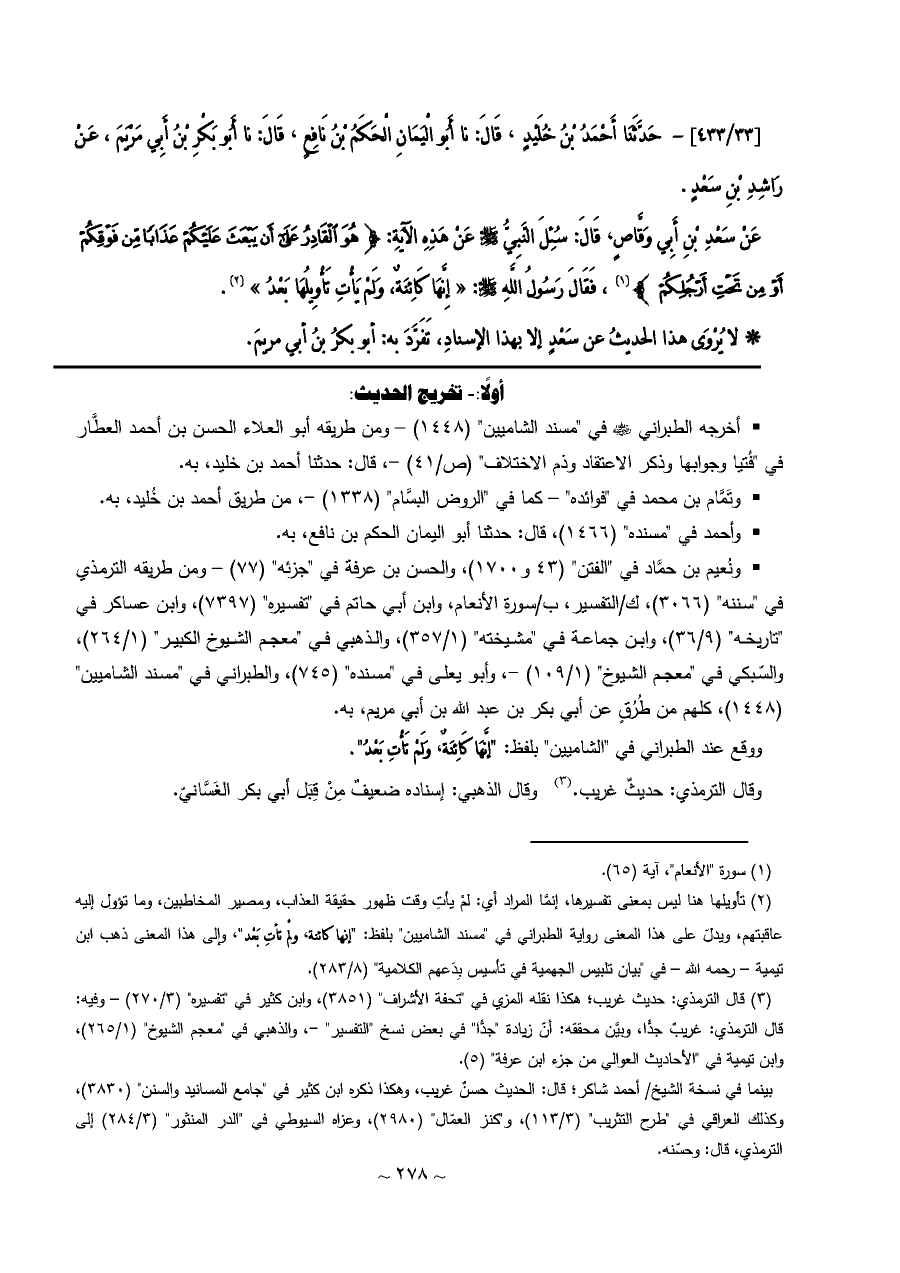 • ونُعيم بن حمَّاد في "الفتن" (٤٣ و ١٧٠٠)، والحسن بن عرفة في "جزئه" (٧٧) - ومن طريقه الترمذي في "سننه" (٣٠٦٦)، ك/التفسير، ب/سورة الأنعام، وابن أبي حاتم في "تفسيره" (٧٣٩٧)، وابن عساكر في "تاريخه" (٩/ ٣٦)، وابن جماعة في "مشيخته" (١/ ٣٥٧)، والذهبي في "معجم الشيوخ الكبير" (١/ ٢٦٤)، والسّبكي في "معجم الشيوخ" (١/ ١٠٩) -، وأبو يعلى في "مسنده" (٧٤٥)، والطبراني في "مسند الشاميين" (١٤٤٨)، كلهم من طُرُقٍ عن أبي بكر بن عبد الله بن أبي مريم، به.