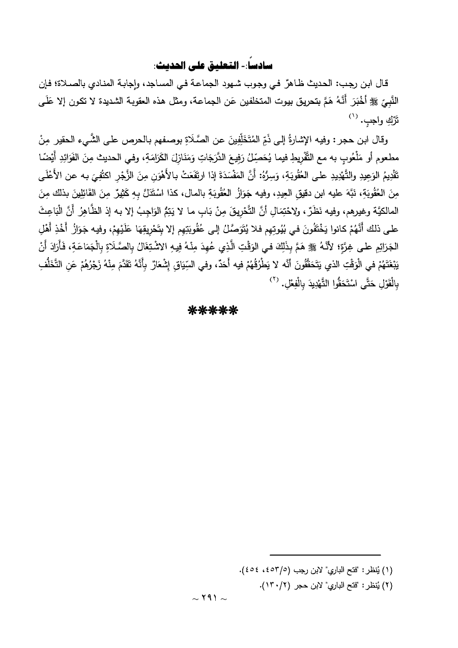 وقال ابن حجر: وفيه الإشارةُ إلى ذَمِّ المُتَخَلِّفِينَ عن الصَّلَاةِ بوصفهم بالحرص على الشَّيء الحقير مِنْ مطعوم أو مَلْعُوبٍ به مع التَّفْرِيطِ فيما يُحَصِّلُ رَفِيعَ الدَّرَجَاتِ وَمَنَازِلَ الكَرَامَةِ، وفي الحديث مِنَ الفَوَائِدِ أَيْضًا تَقْدِيمُ الوَعِيدِ والتَّهْدِيدِ على العُقُوبَةِ، وَسِرُّهُ: أَنَّ المَفْسَدَةَ إذا ارتَفَعَتْ بالأَهْوَنِ مِنَ الزَّجْرِ اكتُفِيَ به عن الأَعْلَى مِنَ العُقُوبَةِ، نَبَّهَ عليه ابن دقيقِ العِيدِ، وفيه جَوَازُ العُقُوبَةِ بالمال، كذا اسْتَدَلَّ بِهِ كَثِيرٌ مِنَ القَائِلِينَ بذلك مِنَ المالكيَّة وغيرهم، وفيه نَظَرٌ، ولاحْتِمَالِ أنَّ التَّحْرِيقَ مِنْ بَابِ ما لا يَتِمُّ الوَاجِبُ إلا به إذ الظَّاهِرُ أَنَّ الْبَاعِثَ على ذلك أَنَّهُمْ كانوا يَخْتَفُونَ في بُيُوتِهِم فلا يُتَوَصَّلُ إلى عُقُوبَتِهِم إلا بِتَحْرِيقِهَا عَلَيْهِمْ، وفيه جَوَازُ أَخْذِ أَهْلِ الجَرَائِمِ على غِرَّةٍ؛ لأنَّهُ - صلى الله عليه وسلم - هَمَّ بِذَلِكَ في الوَقْتِ الَّذِي عُهِدَ مِنْهُ فِيهِ الاشْتِغَالُ بِالصَّلَاةِ بِالْجَمَاعَةِ، فَأَرَادَ أَنْ يَبْغَتَهُمْ في الْوَقْتِ الذي يَتَحَقَّقُونَ أنَّه لا يَطْرُقُهُمْ فيه أَحَدٌ، وفي السِّيَاقِ إِشْعَارٌ بِأَنَّهُ تَقَدَّمَ مِنْهُ زَجْرُهُمْ عَنِ التَّخَلُّفِ بِالْقَوْلِ حَتَّى اسْتَحَقُّوا التَّهْدِيدَ بِالْفِعْلِ. (¬٢)