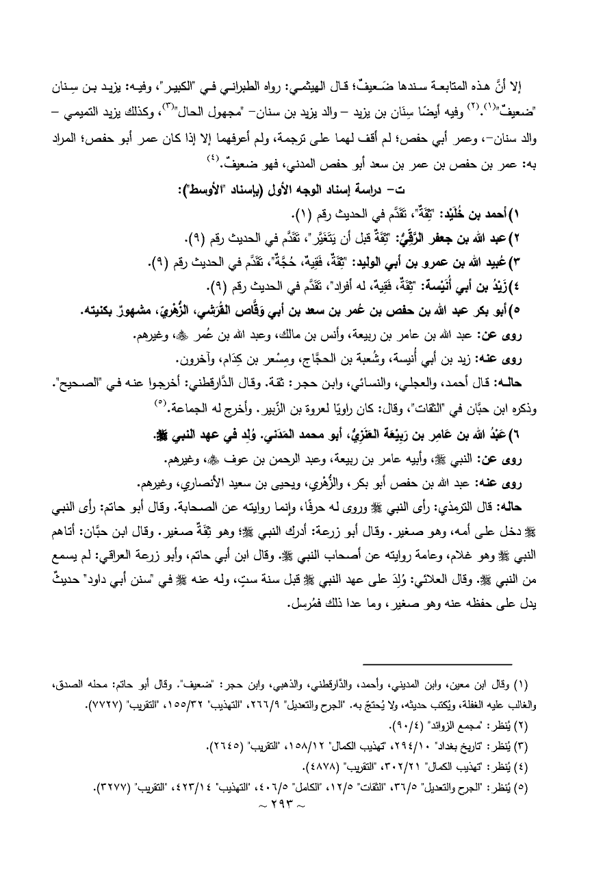 إلا أنَّ هذه المتابعة سندها ضَعيفٌ؛ قال الهيثمي: رواه الطبراني في "الكبير"، وفيه: يزيد بن سِنان "ضعيفٌ" (¬١). (¬٢) وفيه أيضًا سِنَان بن يزيد - والد يزيد بن سنان- "مجهول الحال" (¬٣)، وكذلك يزيد التميمي - والد سنان-، وعمر أبي حفص؛ لم أقف لهما على ترجمة، ولم أعرفهما إلا إذا كان عمر أبو حفص؛ المراد به: عمر بن حفص بن عمر بن سعد أبو حفص المدني، فهو ضعيفٌ. (¬٤)