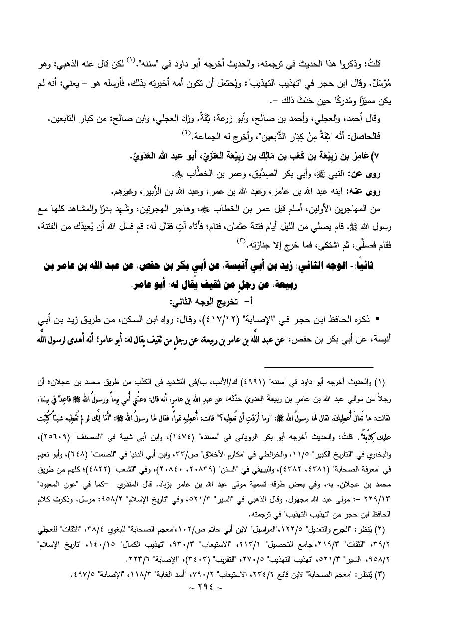 ثانيًا:- الوجه الثاني: زيد بن أبي أُنيسة، عن أبي بكر بن حفص، عن عبد الله بن عامر بن ربيعة، عن رجلٍ من ثقيف يُقال له: أبو عامر.