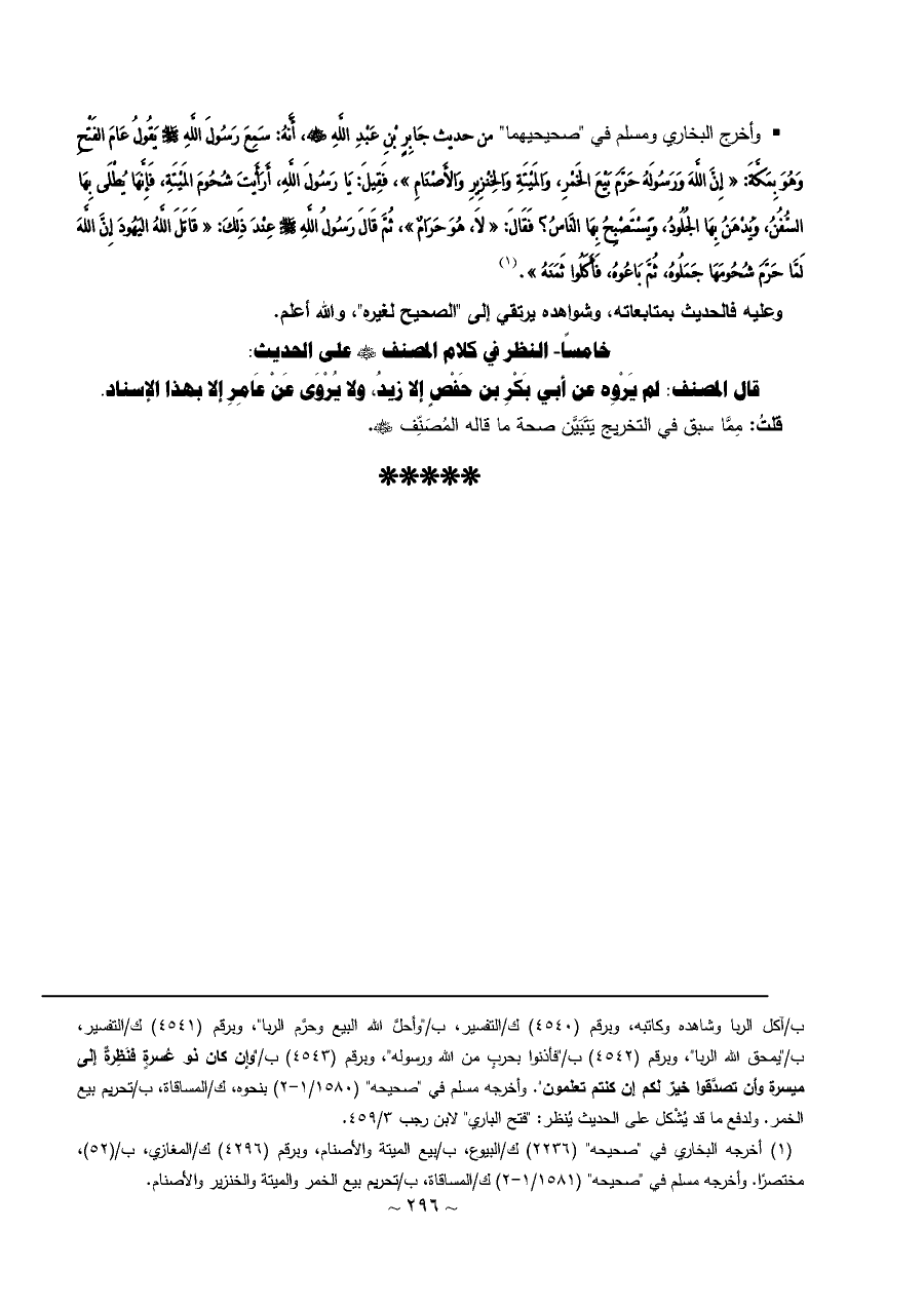 • وأخرج البخاري ومسلم في "صحيحيهما" من حديث جَابِرٍ بْنِ عَبْدِ اللَّهِ - رضي الله عنه -، أَنَّهُ: سَمِعَ رَسُولَ اللَّهِ - صلى الله عليه وسلم - يَقُولُ عَامَ الفَتْحِ وَهُوَ بِمَكَّةَ: «إِنَّ اللَّهَ وَرَسُولَهُ حَرَّمَ بَيْعَ الخَمْرِ، وَالمَيْتَةِ وَالخِنْزِيرِ وَالأَصْنَامِ»، فَقِيلَ: يَا رَسُولَ اللَّهِ، أَرَأَيْتَ شُحُومَ المَيْتَةِ، فَإِنَّهَا يُطْلَى بِهَا السُّفُنُ، وَيُدْهَنُ بِهَا الجُلُودُ، وَيَسْتَصْبِحُ بِهَا النَّاسُ؟ فَقَالَ: «لَا، هُوَ حَرَامٌ»، ثُمَّ قَالَ رَسُولُ اللَّهِ - صلى الله عليه وسلم - عِنْدَ ذَلِكَ: «قَاتَلَ اللَّهُ اليَهُودَ إِنَّ اللَّهَ لَمَّا حَرَّمَ شُحُومَهَا جَمَلُوهُ، ثُمَّ بَاعُوهُ، فَأَكَلُوا ثَمَنَهُ». (¬١)
