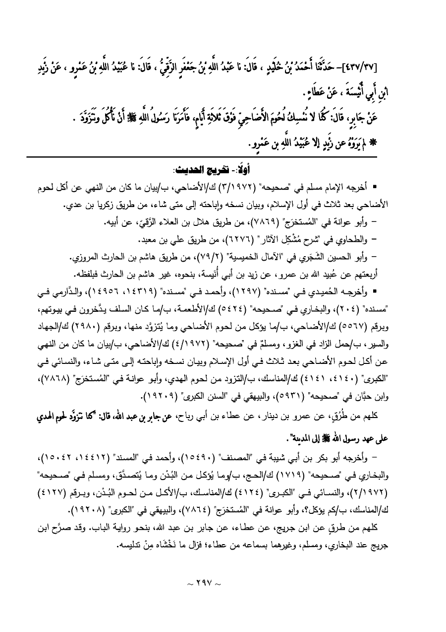 • أخرجه الإمام مسلم في "صحيحه" (١٩٧٢/ ٣) ك/الأضاحي، ب/بيان ما كان من النهي عن أكل لحوم الأضاحي بعد ثلاث في أول الإسلام، وبيان نسخه وإباحته إلى متى شاء، من طريق زكريا بن عدي.