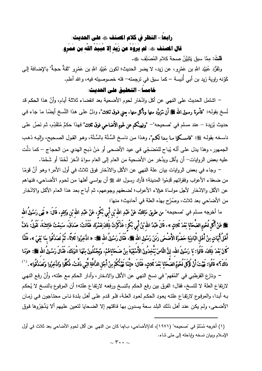 ما أخرجه مسلم في "صحيحه" من طريق مَالِكٌ، عَنْ عَبْدِ اللهِ بْنِ أَبِي بَكْرٍ، عَنْ عَبْدِ اللهِ بْنِ وَاقِدٍ، قَالَ: «نَهَى رَسُولُ اللهِ - صلى الله عليه وسلم - عَنْ أَكْلِ لُحُومِ الضَّحَايَا بَعْدَ ثَلاثٍ»، قَالَ عَبْدُ اللهِ بْنُ أَبِي بَكْرٍ: فَذَكَرْتُ ذَلِكَ لِعَمْرَةَ، فَقَالَتْ: صَدَقَ، سَمِعْتُ عَائِشَةَ، تَقُولُ: دَفَّ أَهْلُ أَبْيَاتٍ مِنْ أَهْلِ الْبَادِيَةِ حَضْرَةَ الأَضْحَى زَمَنَ رَسُولِ اللهِ - صلى الله عليه وسلم -، فَقَالَ رَسُولُ اللهِ - صلى الله عليه وسلم -: «ادَّخِرُوا ثَلاثًا، ثُمَّ تَصَدَّقُوا بِمَا بَقِيَ»، فَلَمَّا كَانَ بَعْدَ ذَلِكَ، قَالُوا: يَا رَسُولَ اللهِ، إِنَّ النَّاسَ يَتَّخِذُونَ الأَسْقِيَةَ مِنْ ضَحَايَاهُمْ، وَيَجْمُلُونَ مِنْهَا الْوَدَكَ، فَقَالَ رَسُولُ اللهِ - صلى الله عليه وسلم -: «وَمَا ذَاكَ؟» قَالُوا: نَهَيْتَ أَنْ تُؤْكَلَ لُحُومُ الضَّحَايَا بَعْدَ ثَلاثٍ، فَقَالَ: «إِنَّمَا نَهَيْتُكُمْ مِنْ أَجْلِ الدَّافَّةِ الَّتِي دَفَّتْ، فَكُلُوا وَادَّخِرُوا وَتَصَدَّقُوا». (¬١)