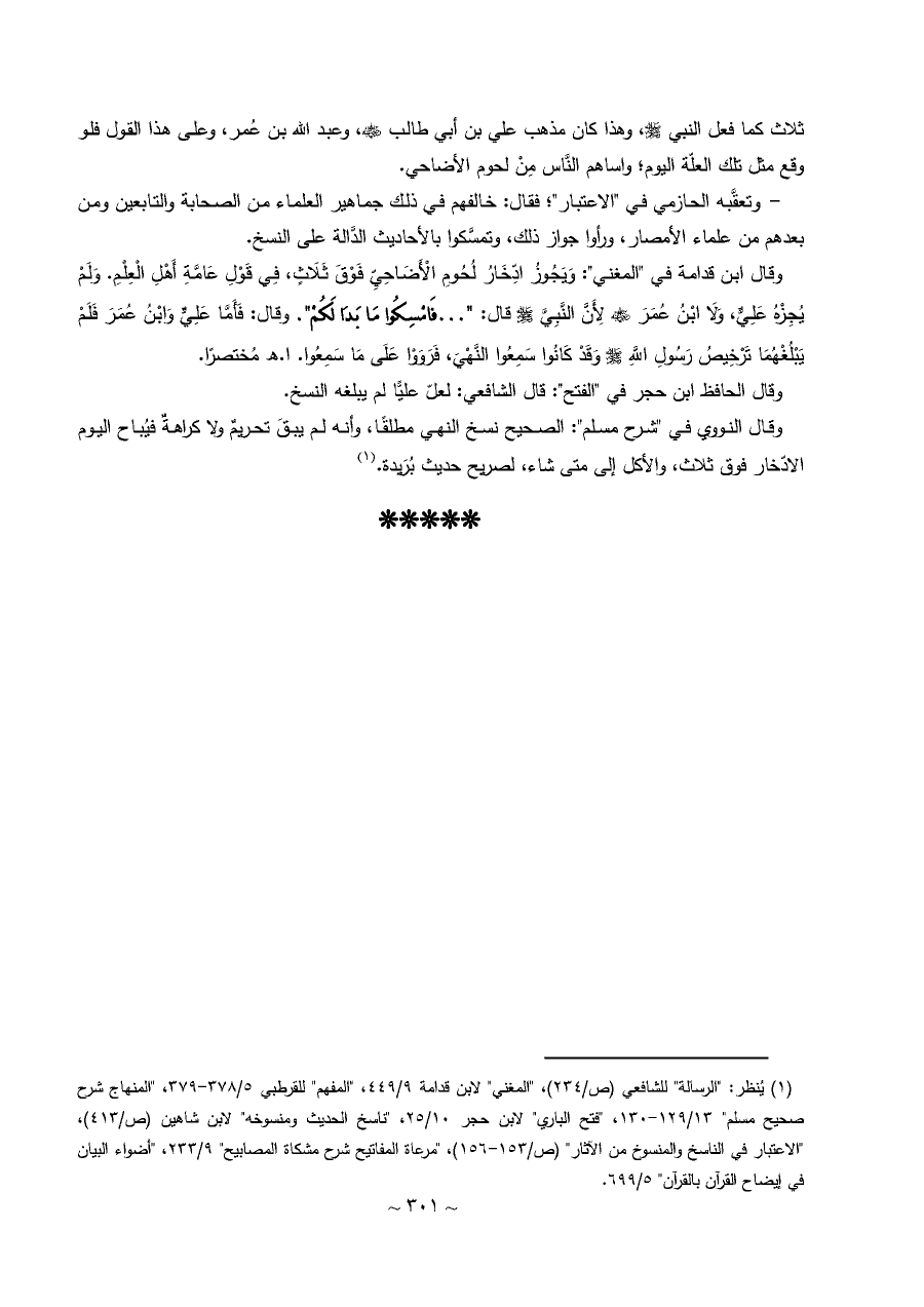 وقال ابن قدامة في "المغني": وَيَجُوزُ ادِّخَارُ لُحُومِ الْأَضَاحِيِّ فَوْقَ ثَلَاثٍ، فِي قَوْلِ عَامَّةِ أَهْلِ الْعِلْمِ. وَلَمْ يُجِزْهُ عَلِيٌّ، وَلَا ابْنُ عُمَرَ - رضي الله عنه - لِأَنَّ النَّبِيَّ - صلى الله عليه وسلم - قال: " ... فَامْسِكُوا مَا بَدَا لَكُمْ". وقال: فَأَمَّا عَلِيٌّ وَابْنُ عُمَرَ فَلَمْ يَبْلُغْهُمَا تَرْخِيصُ رَسُولِ اللَّهِ - صلى الله عليه وسلم - وَقَدْ كَانُوا سَمِعُوا النَّهْيَ، فَرَوَوْا عَلَى مَا سَمِعُوا. ا. هـ مُختصرًا.